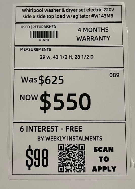 - Whirlpool washer & dryer set electric 220v side x side top load w/agitator #W143MB
