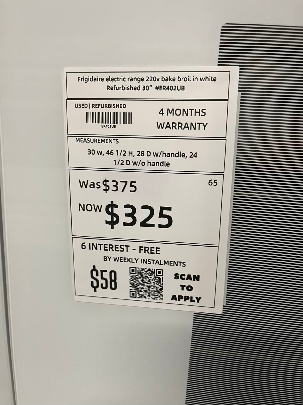Frigidaire electric range 220v bake broil in white Refurbished 30" #ER402UB