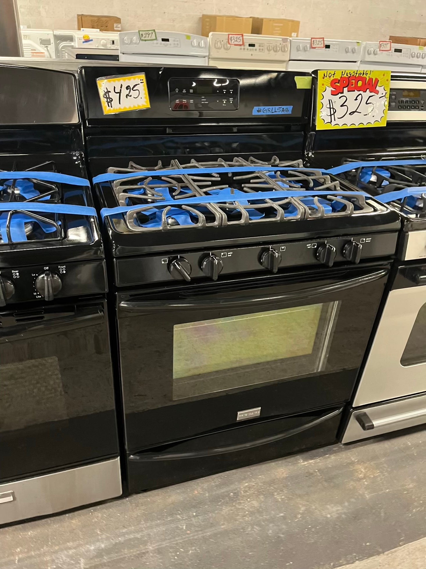 - Frigidaire GAS range black 5 burner bake broil self clean 30” item number #GR115AB
