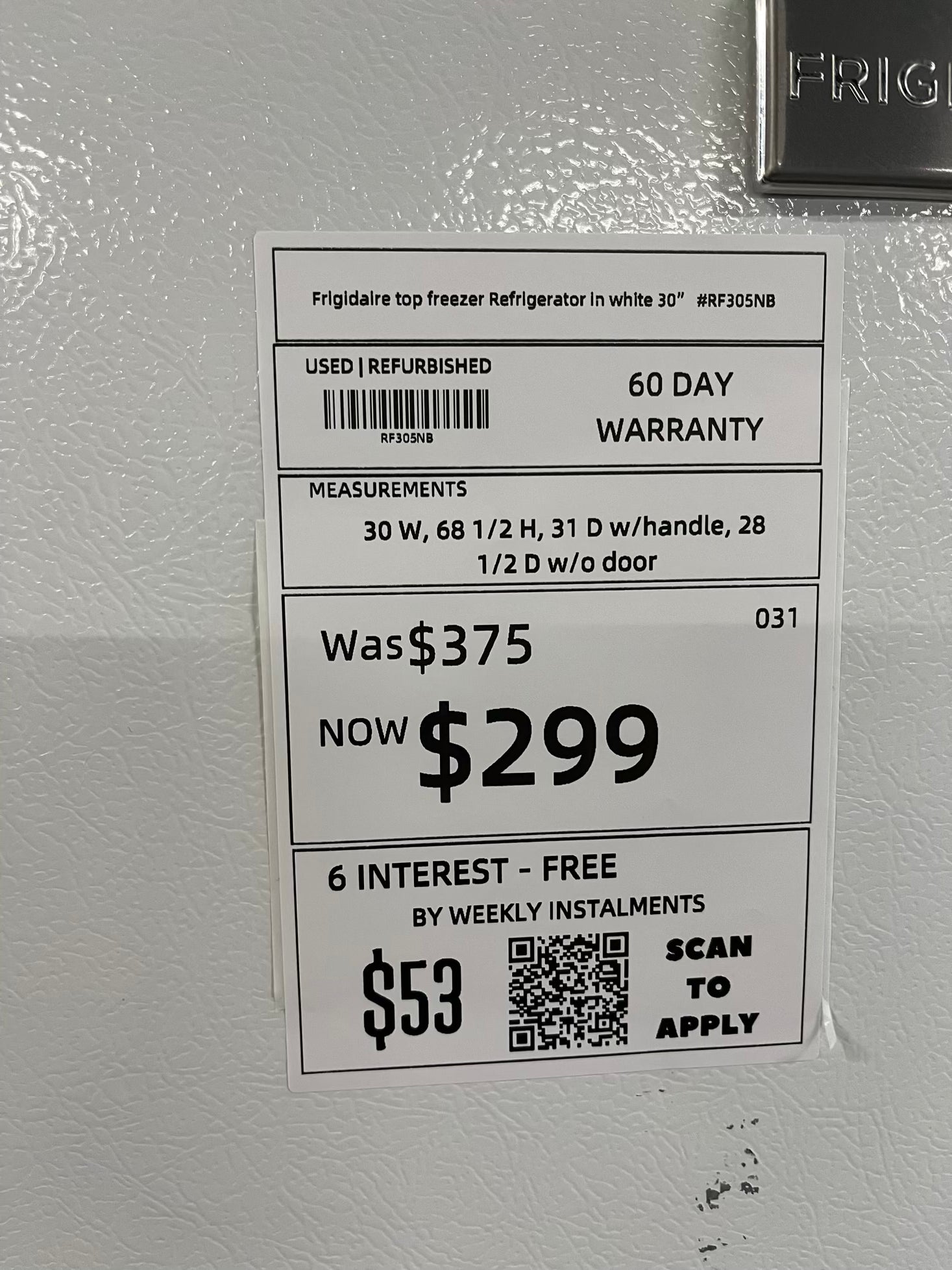 - Frigidaire top freezer Refrigerator in white 30" #RF305NB