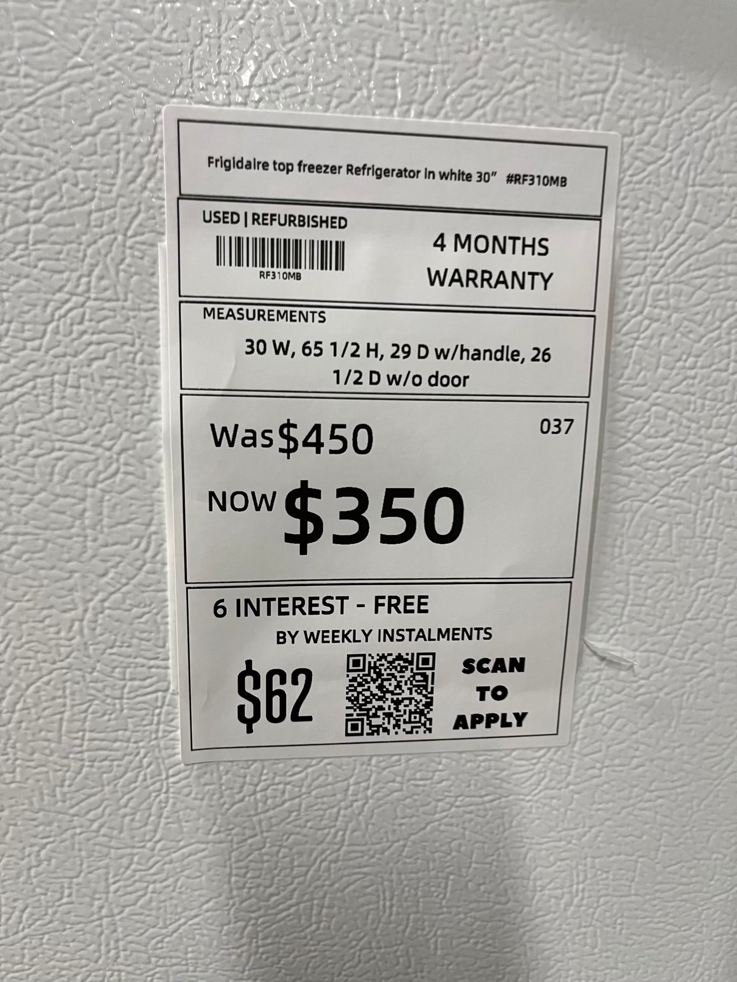 -Frigidalre top freezer Refrigerator In white 30" #RF310MB