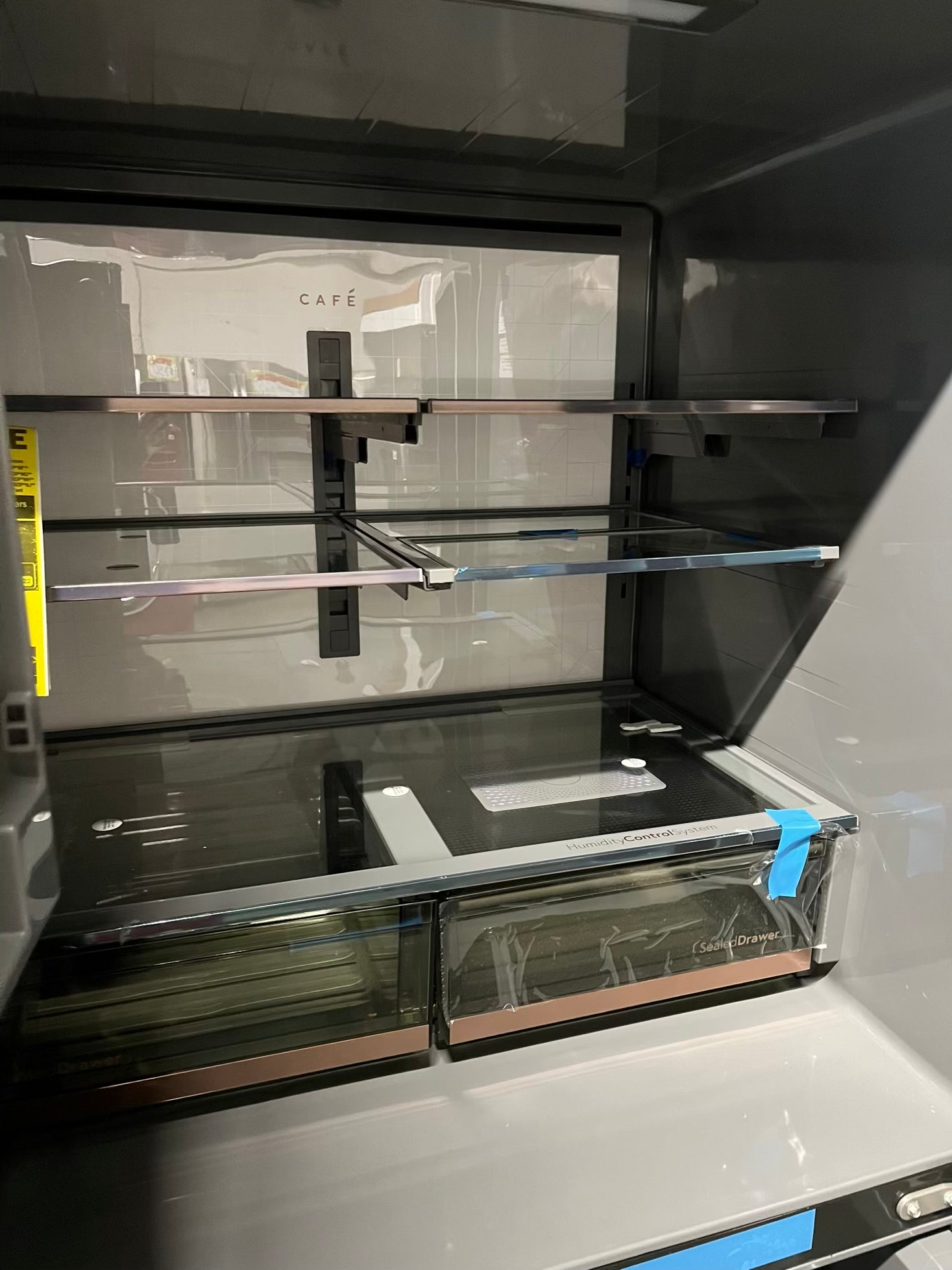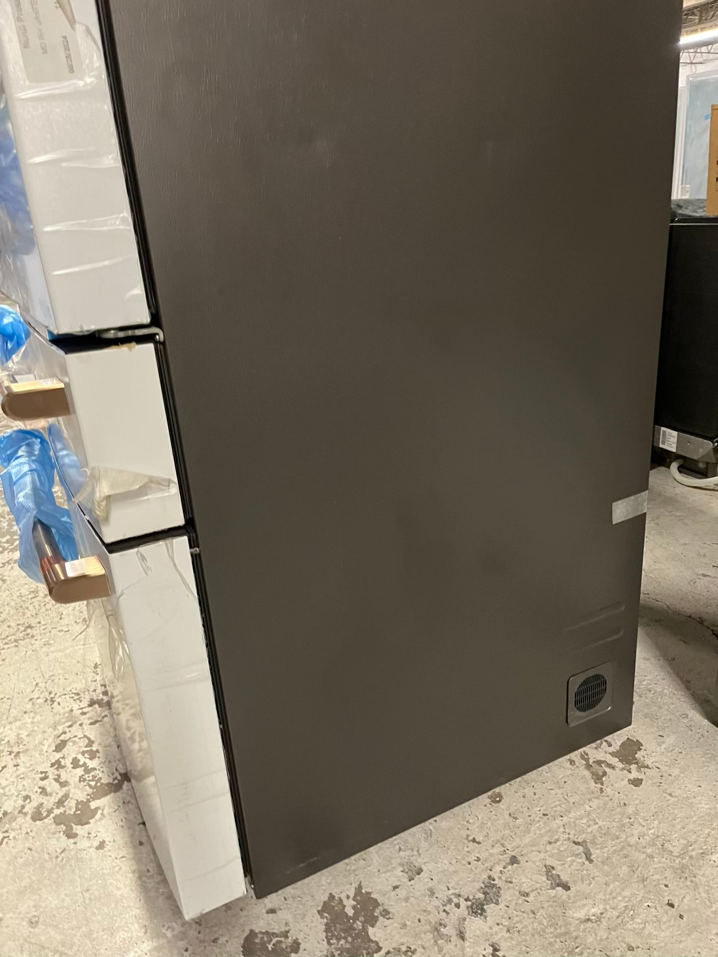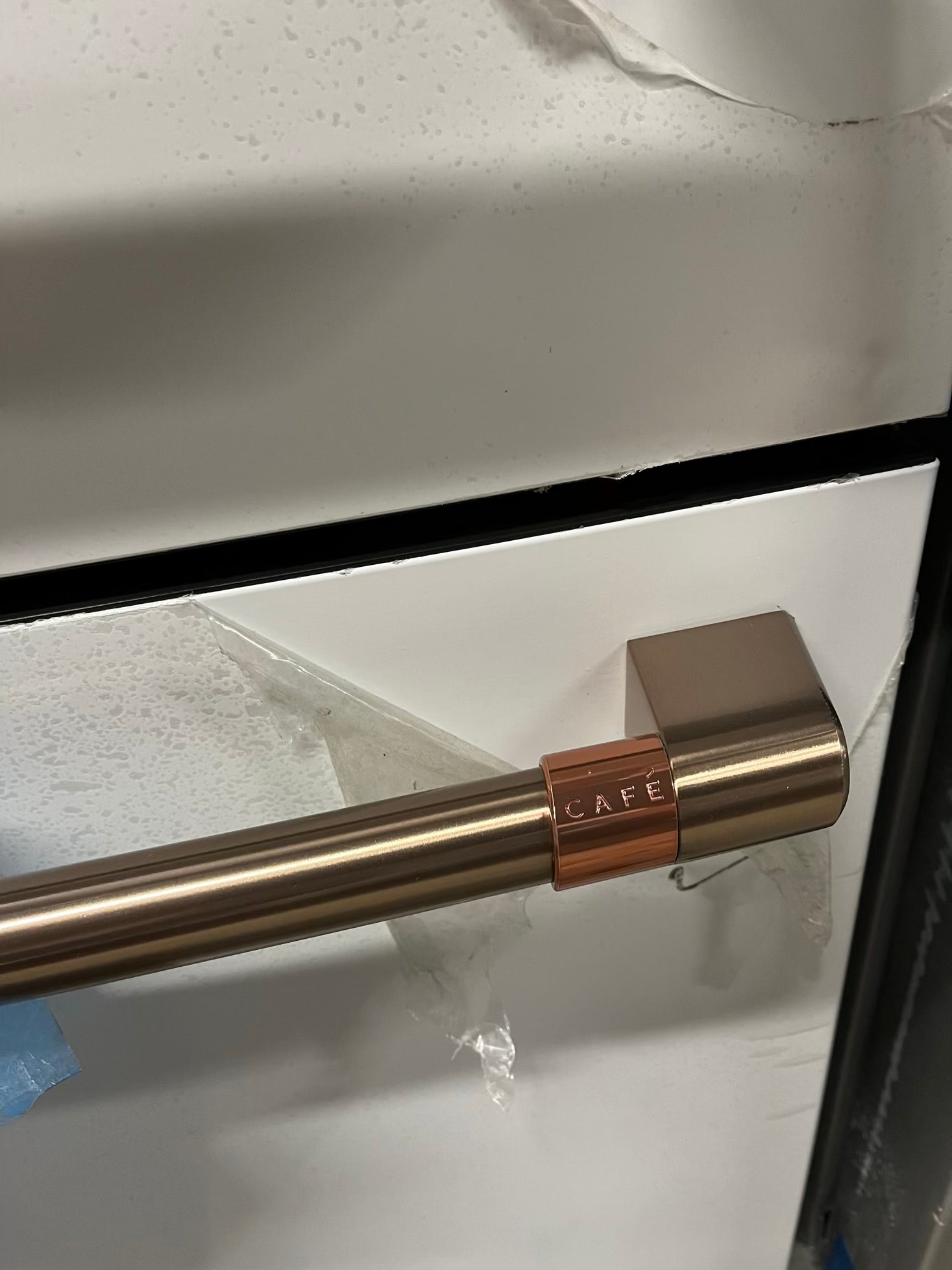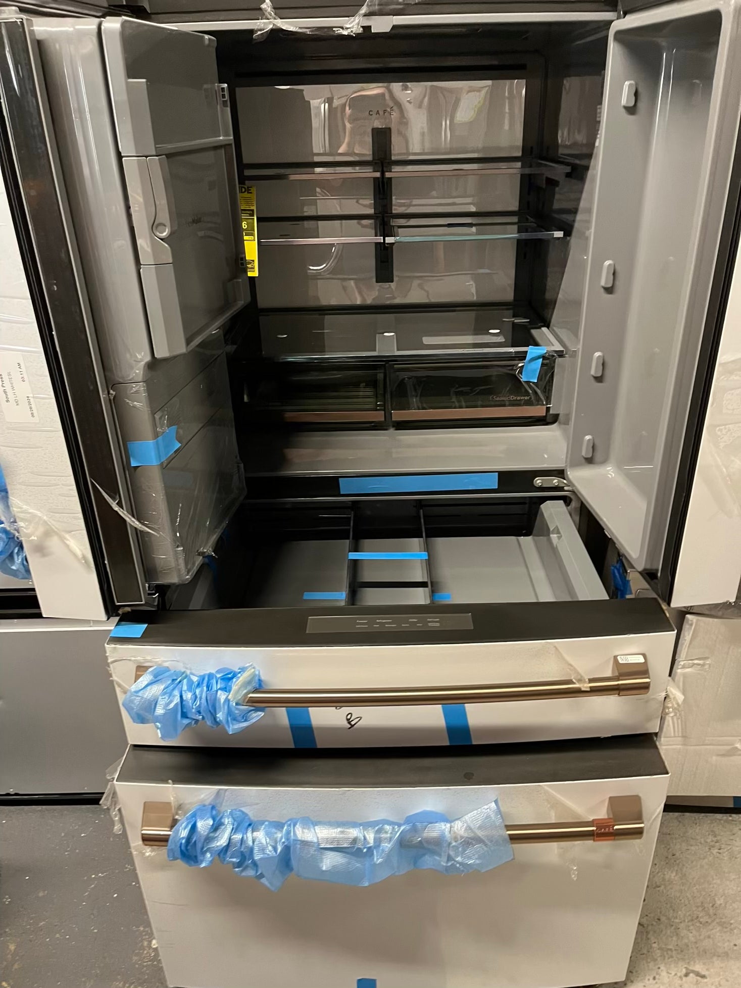 GE Café 36 Inch 4-Door French-Door Smart Refrigerator with 27.8 Cu. Pt. Capacity, TwinChill™, Convertible Drawer, LED Light Tower, Auto Fill, Humidity Control System, Shabbos Mode ENERGY STAR® Matte White with Brushed Bronze Handles 36” #RF840EB
