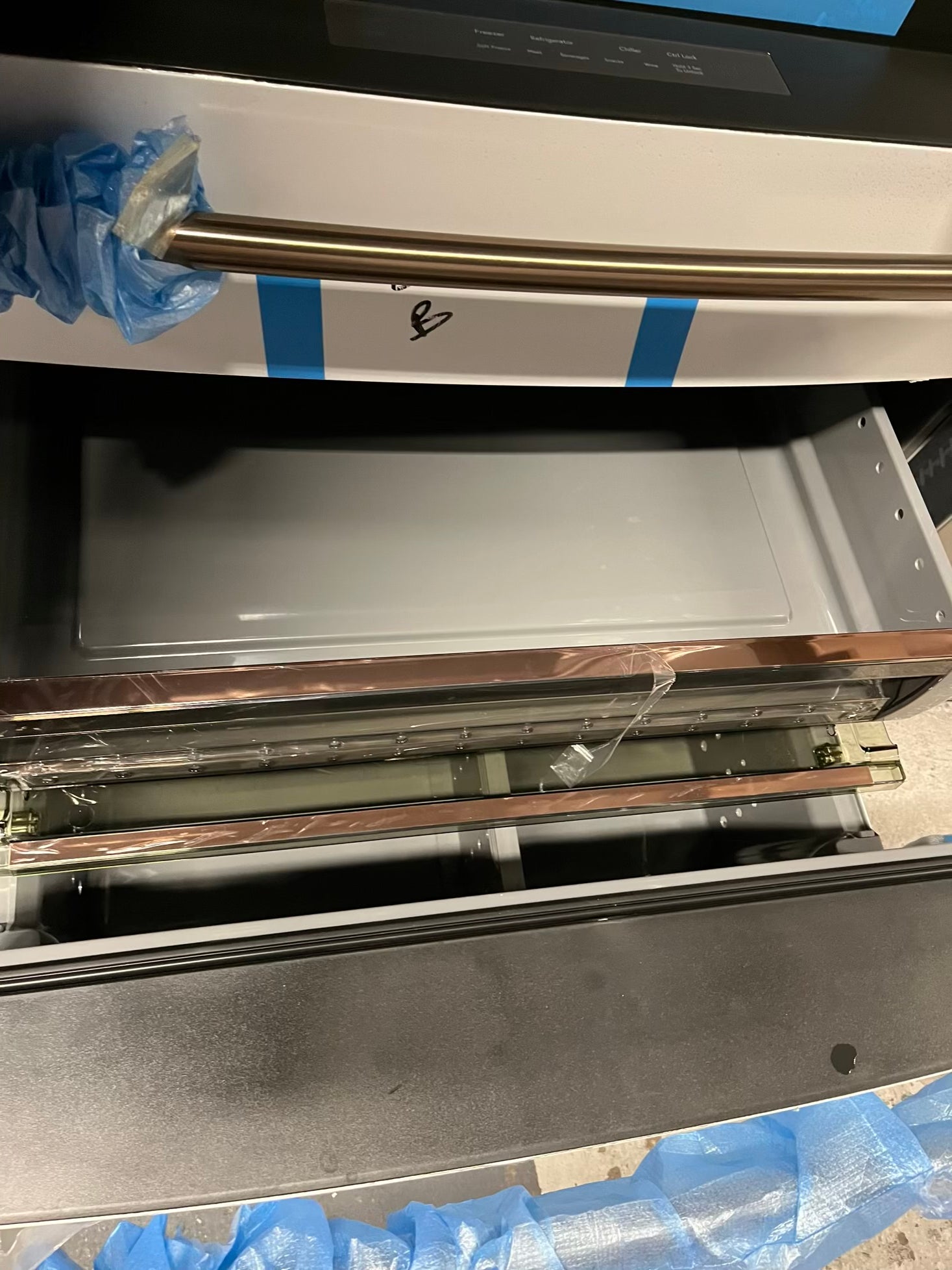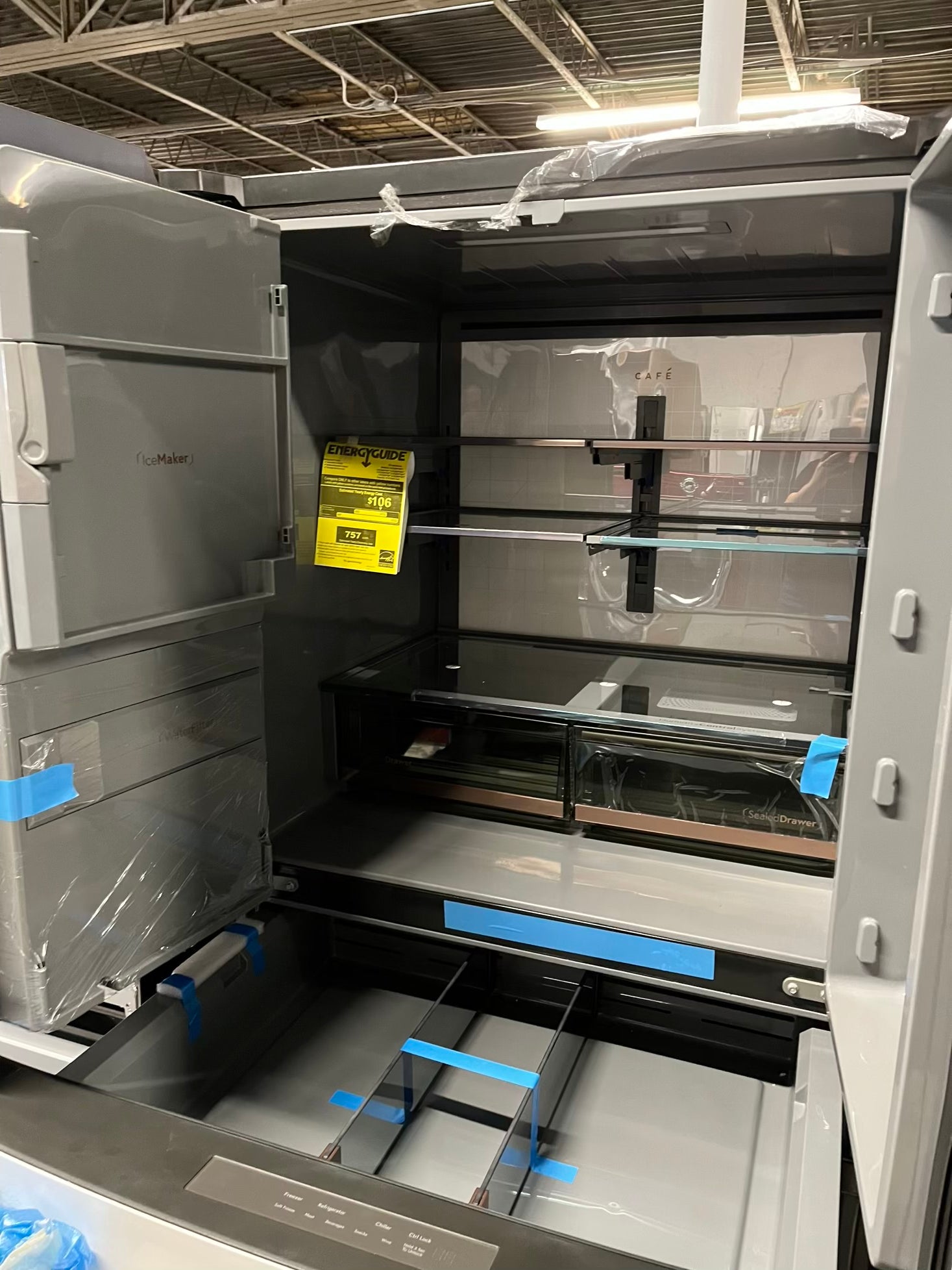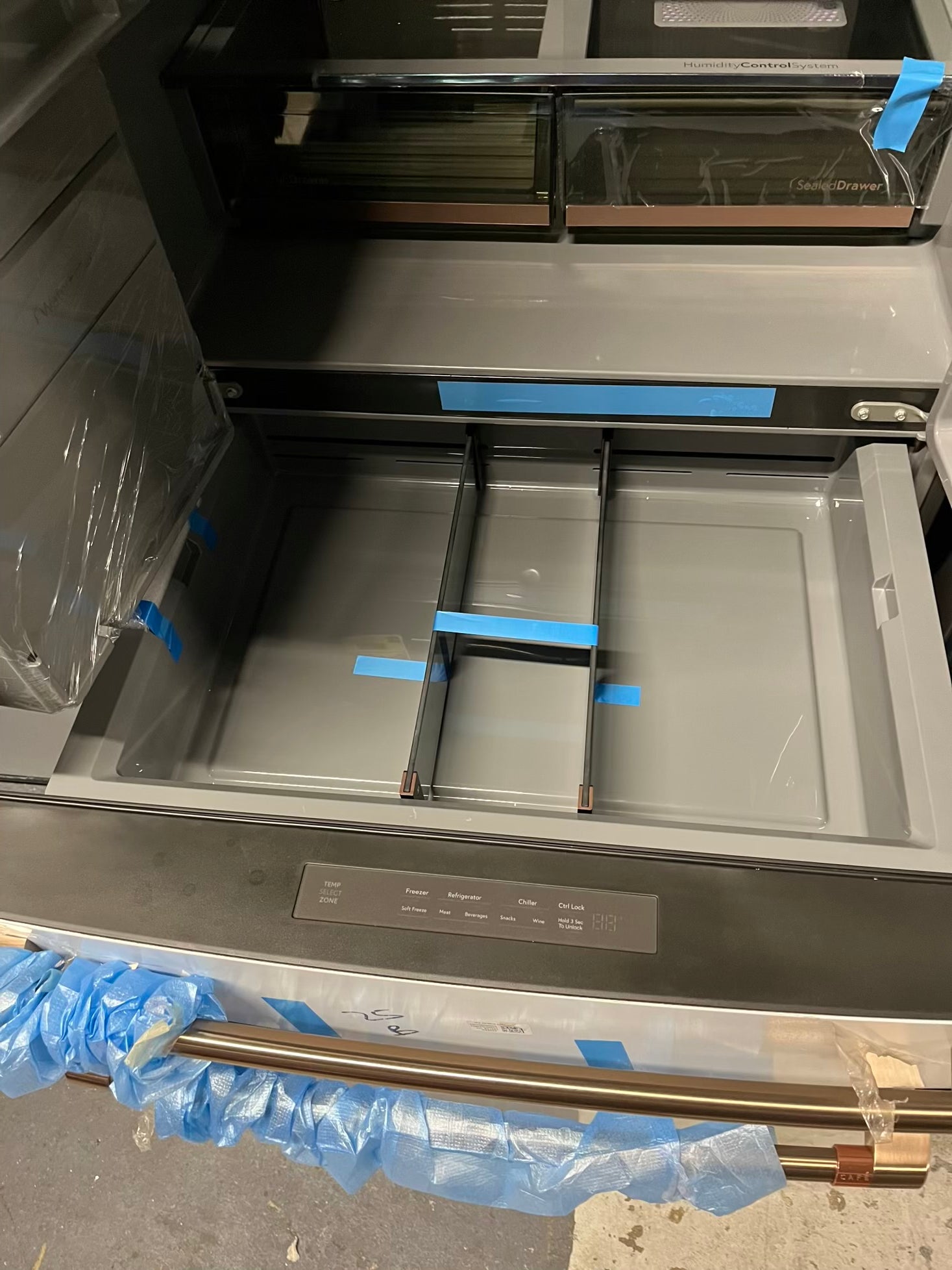 GE Café 36 Inch 4-Door French-Door Smart Refrigerator with 27.8 Cu. Pt. Capacity, TwinChill™, Convertible Drawer, LED Light Tower, Auto Fill, Humidity Control System, Shabbos Mode ENERGY STAR® Matte White with Brushed Bronze Handles 36” #RF840EB