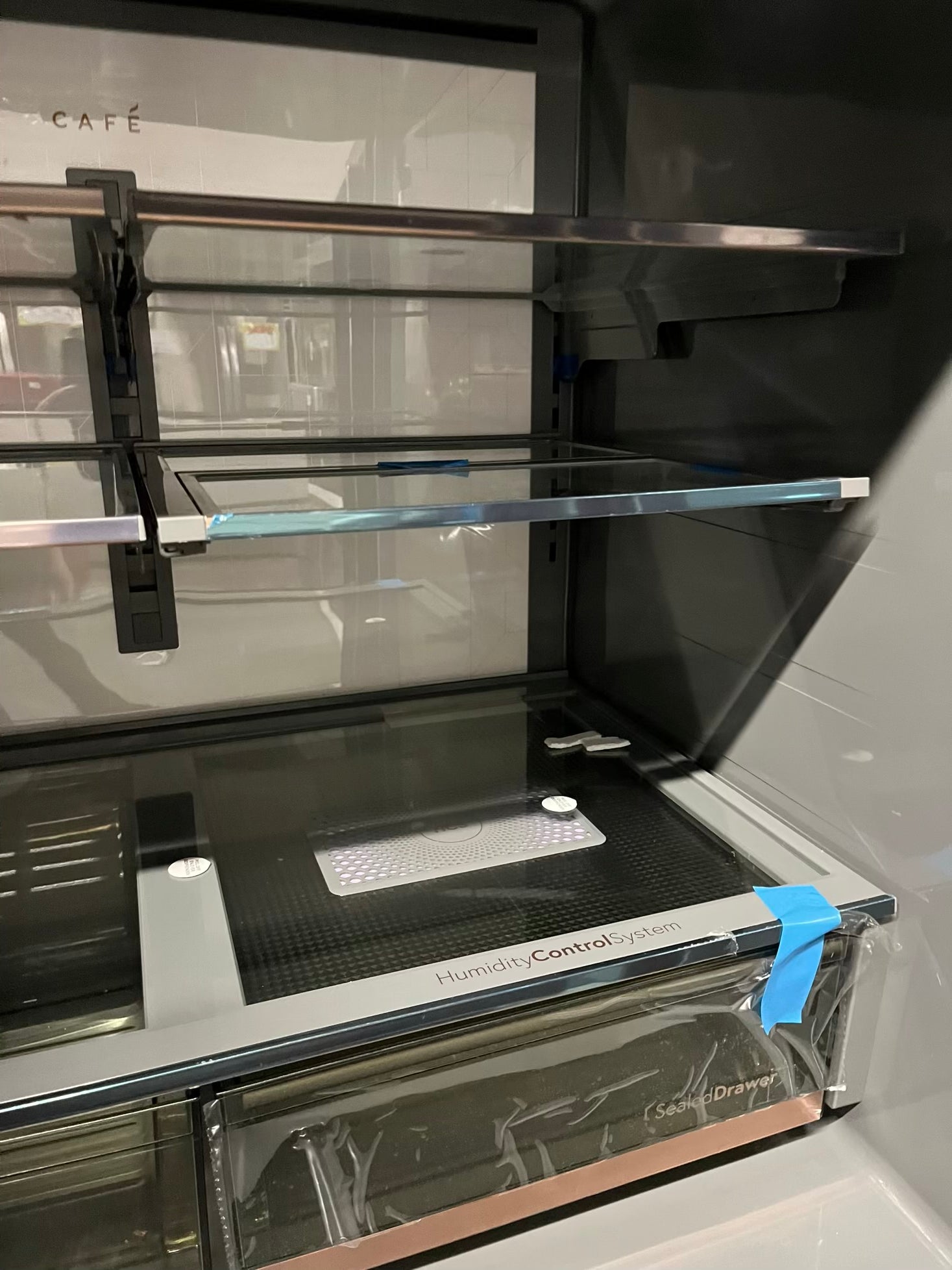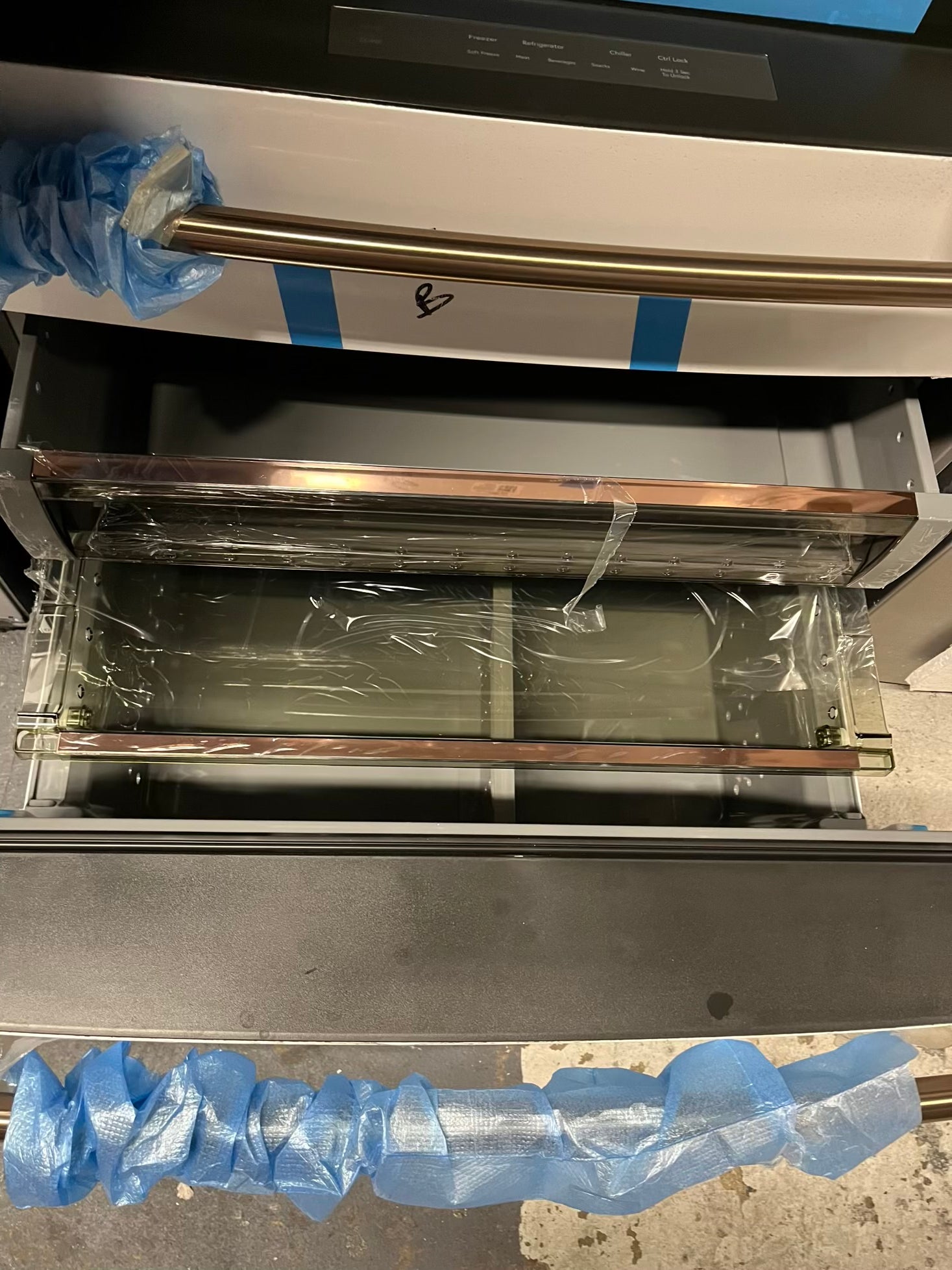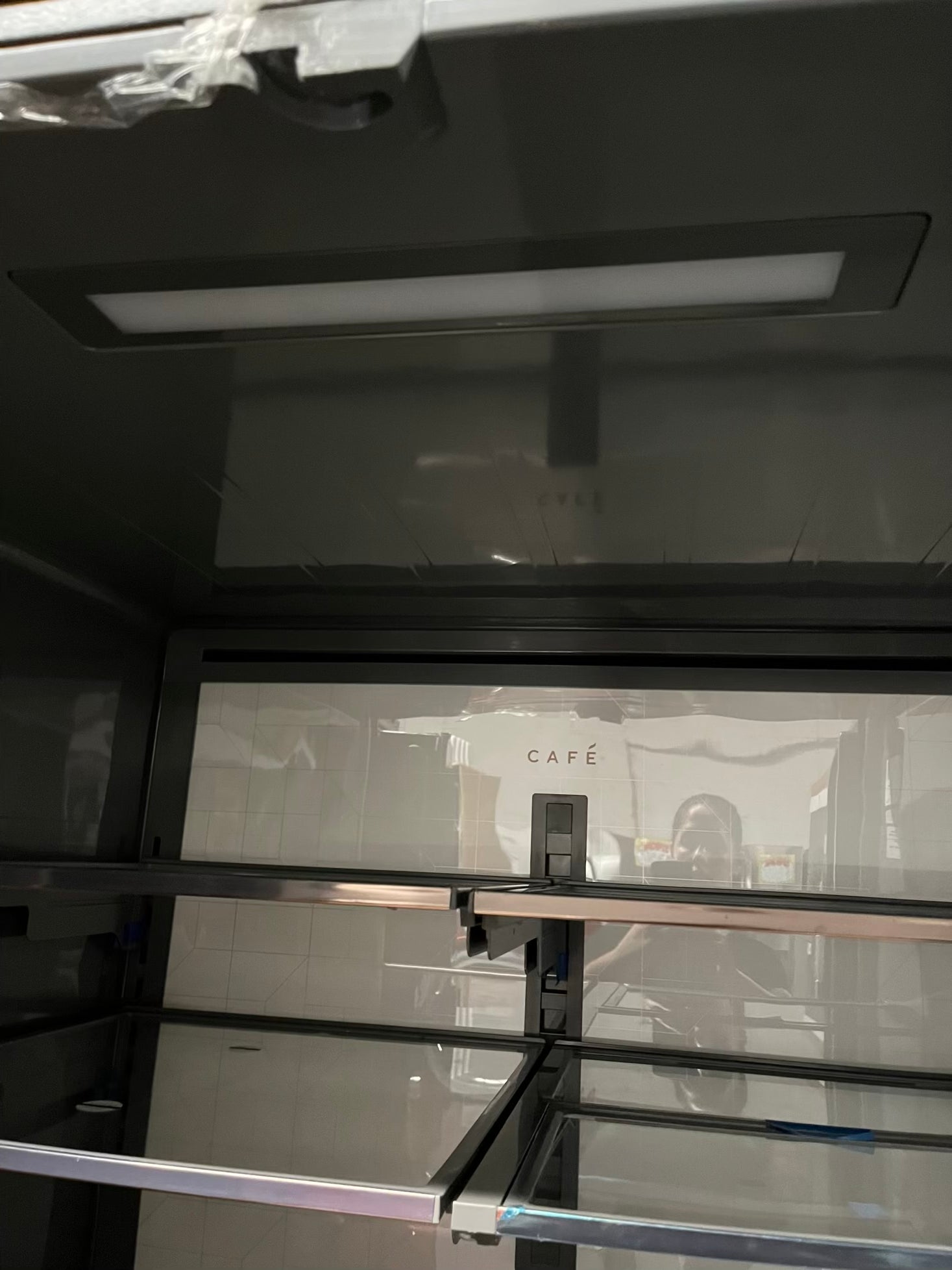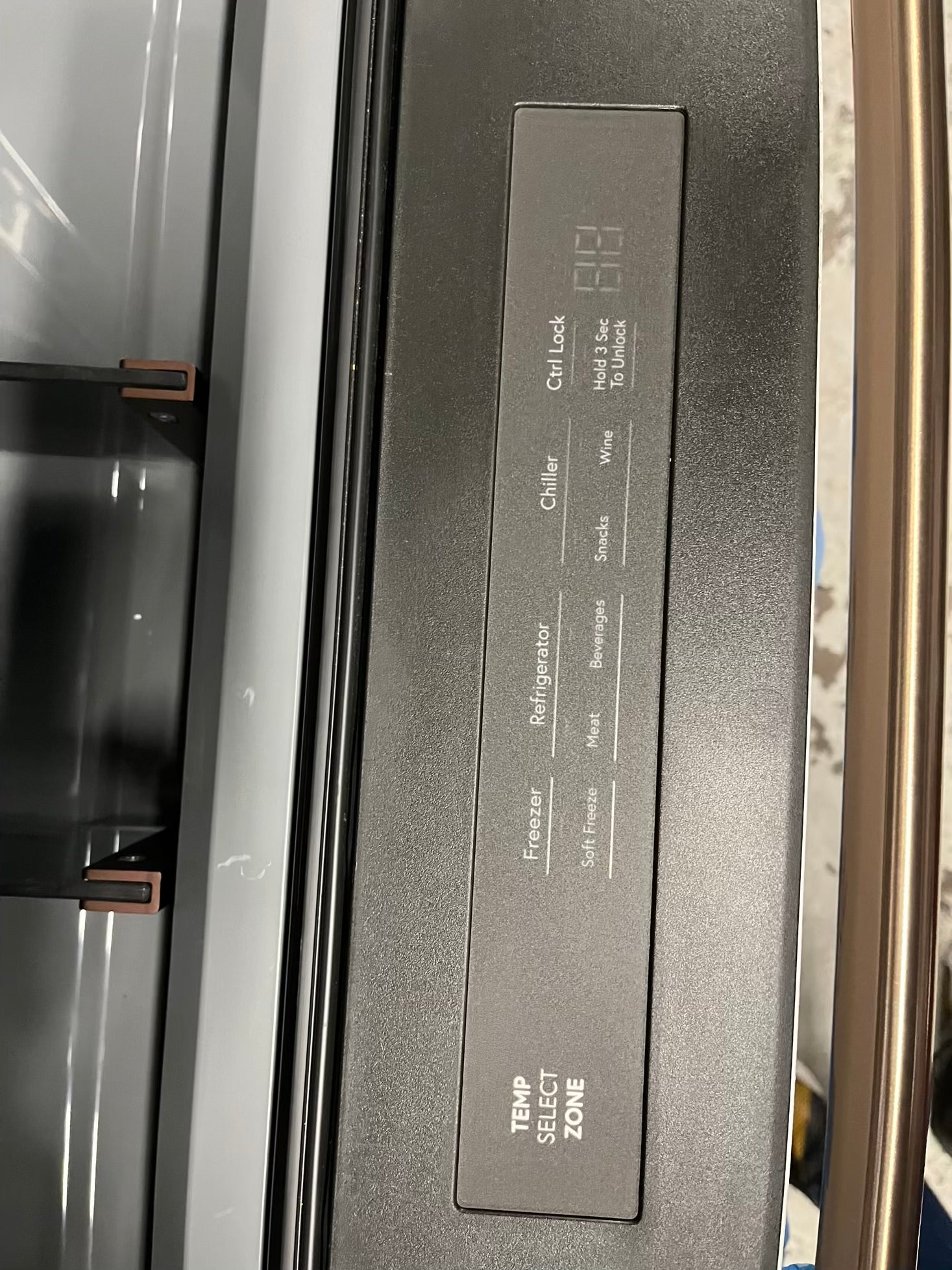 GE Café 36 Inch 4-Door French-Door Smart Refrigerator with 27.8 Cu. Pt. Capacity, TwinChill™, Convertible Drawer, LED Light Tower, Auto Fill, Humidity Control System, Shabbos Mode ENERGY STAR® Matte White with Brushed Bronze Handles 36” #RF840EB