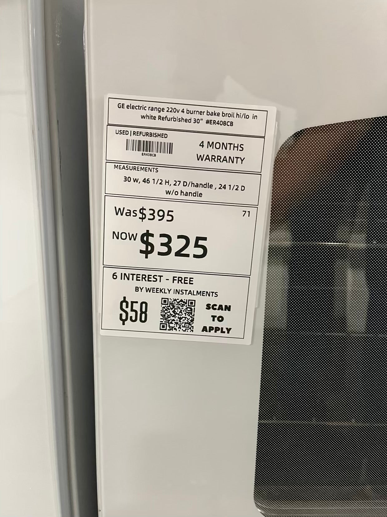 GE electric range 220v 4 burner bake broil hi/lo in white Refurbished 30" #ER408CB