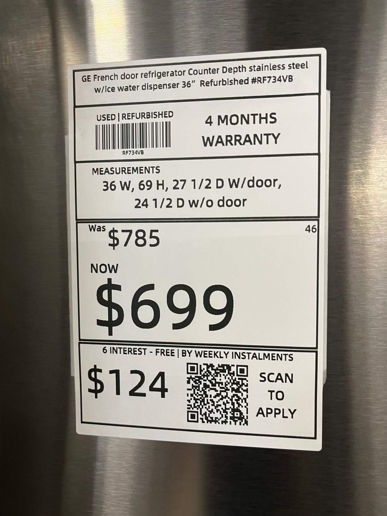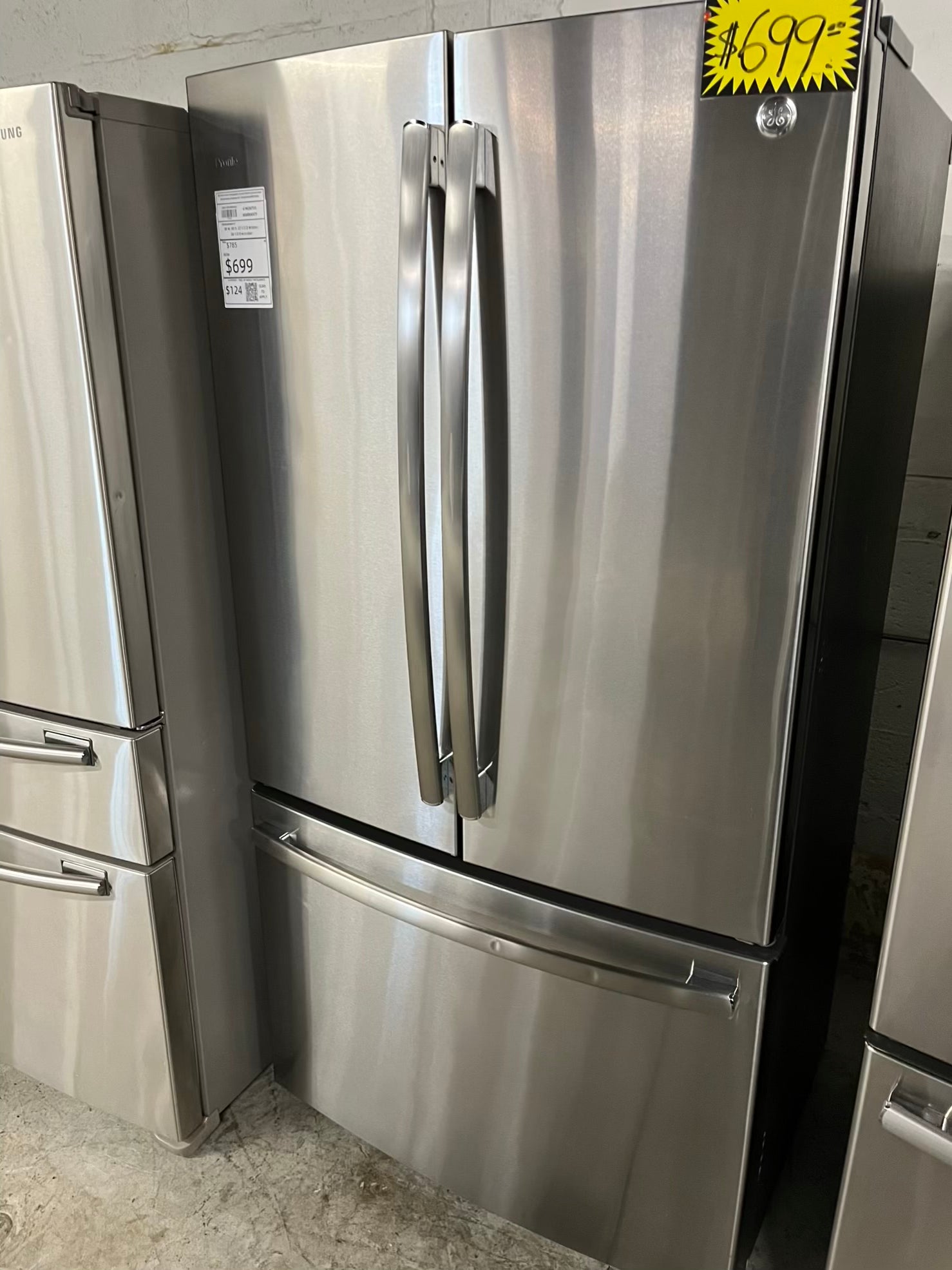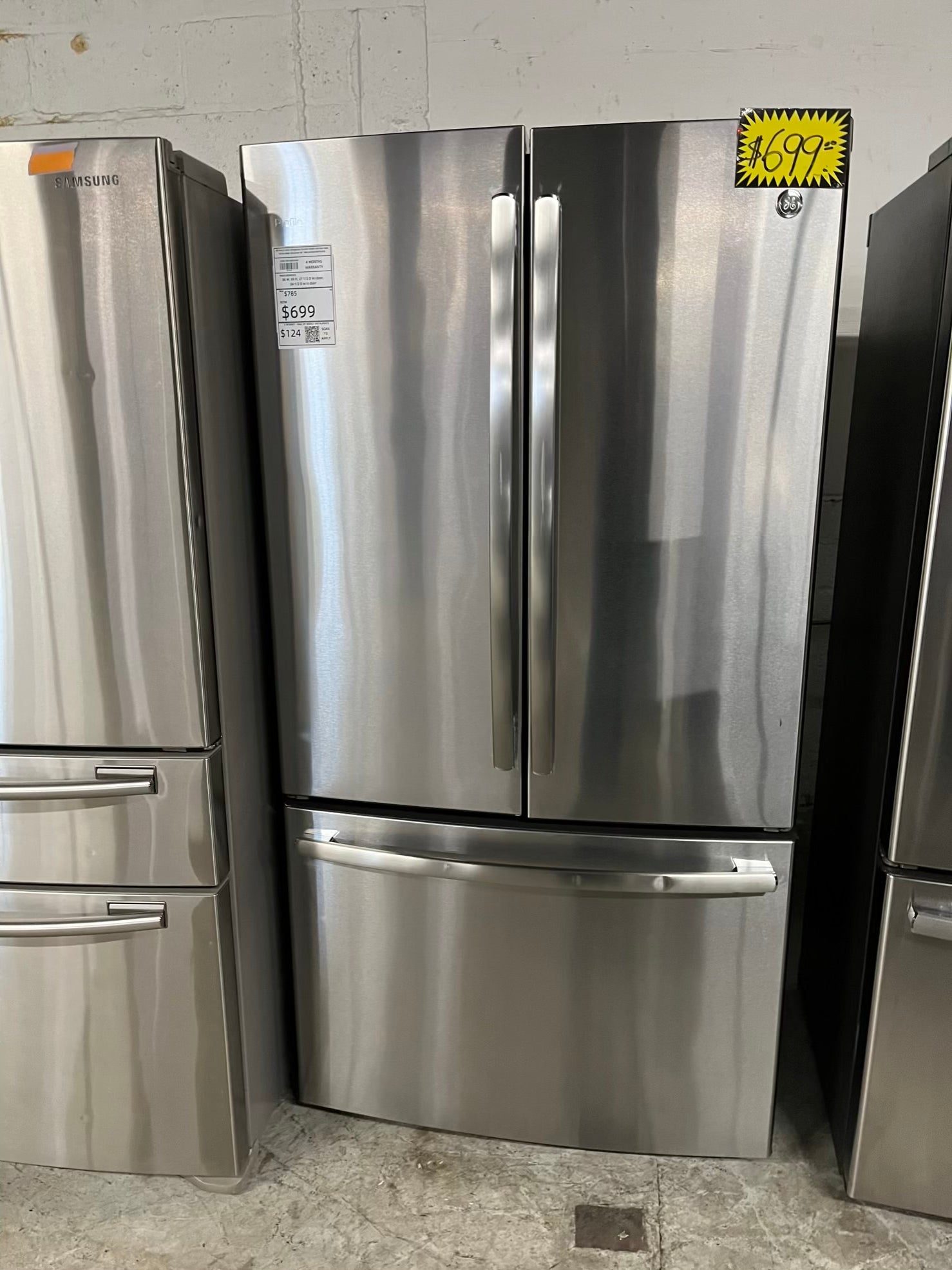 GE French door Refrigerator counter depth stainless steel w/water dispenser & ice maker inside Item number #RF734VB 36” in Refurbished