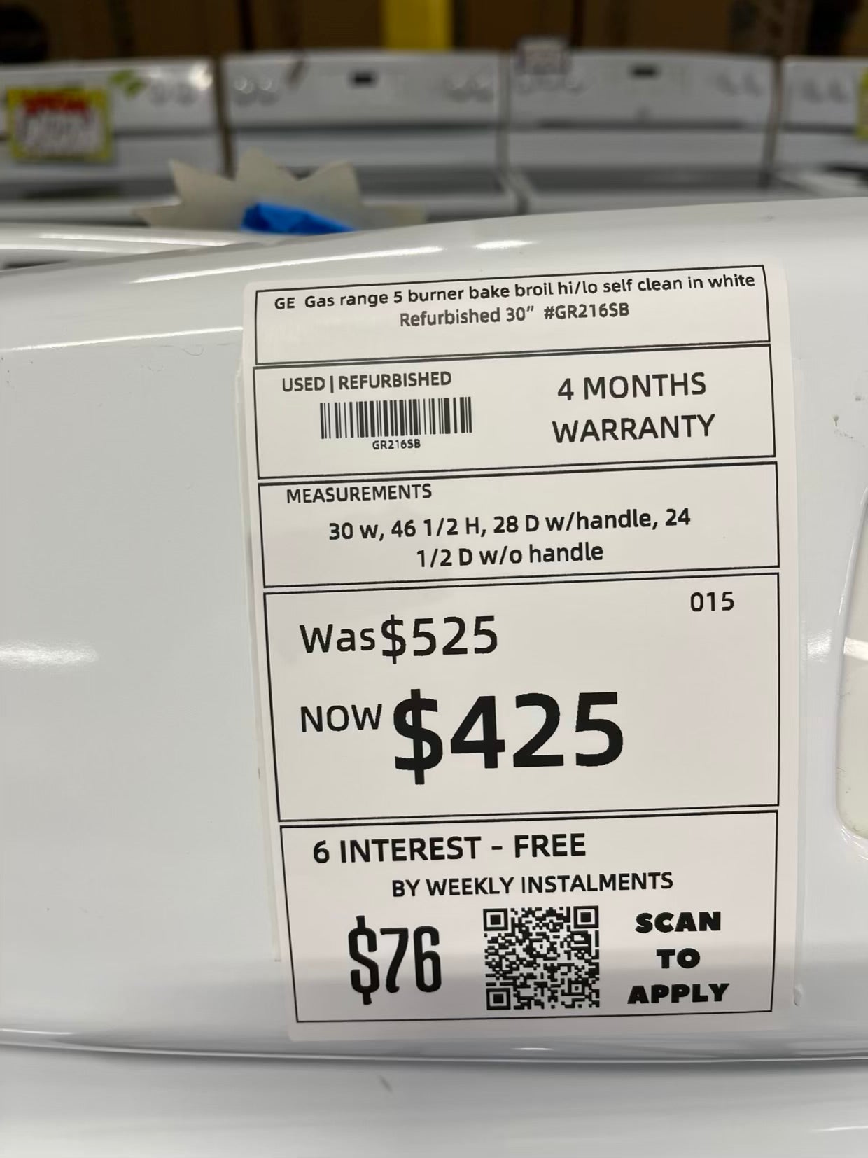 GE Gas range 5 burner bake broil hi/lo self clean in white Refurbished 30" #GR2165B