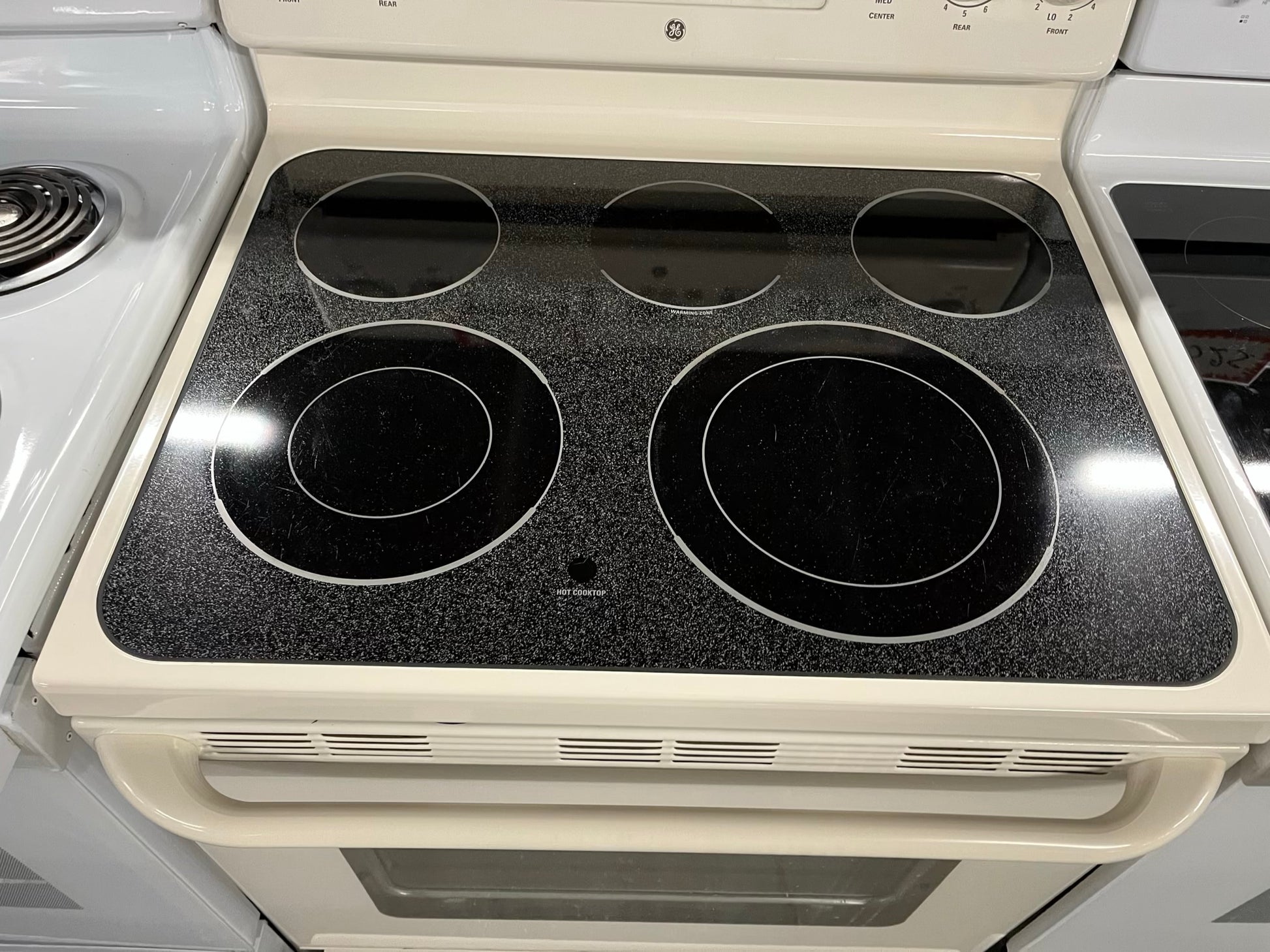 GE off White electric range 5 burner warming zone bake broil self clean 30” #RF900KB-TR