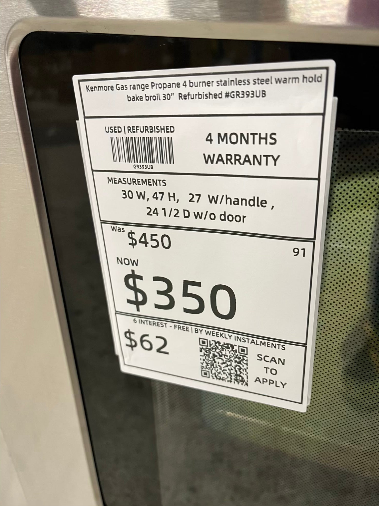 - Kenmore Gas range Propane 4 burner stainless steel warm hold bake broil 30" Refurbished #GR393UB
