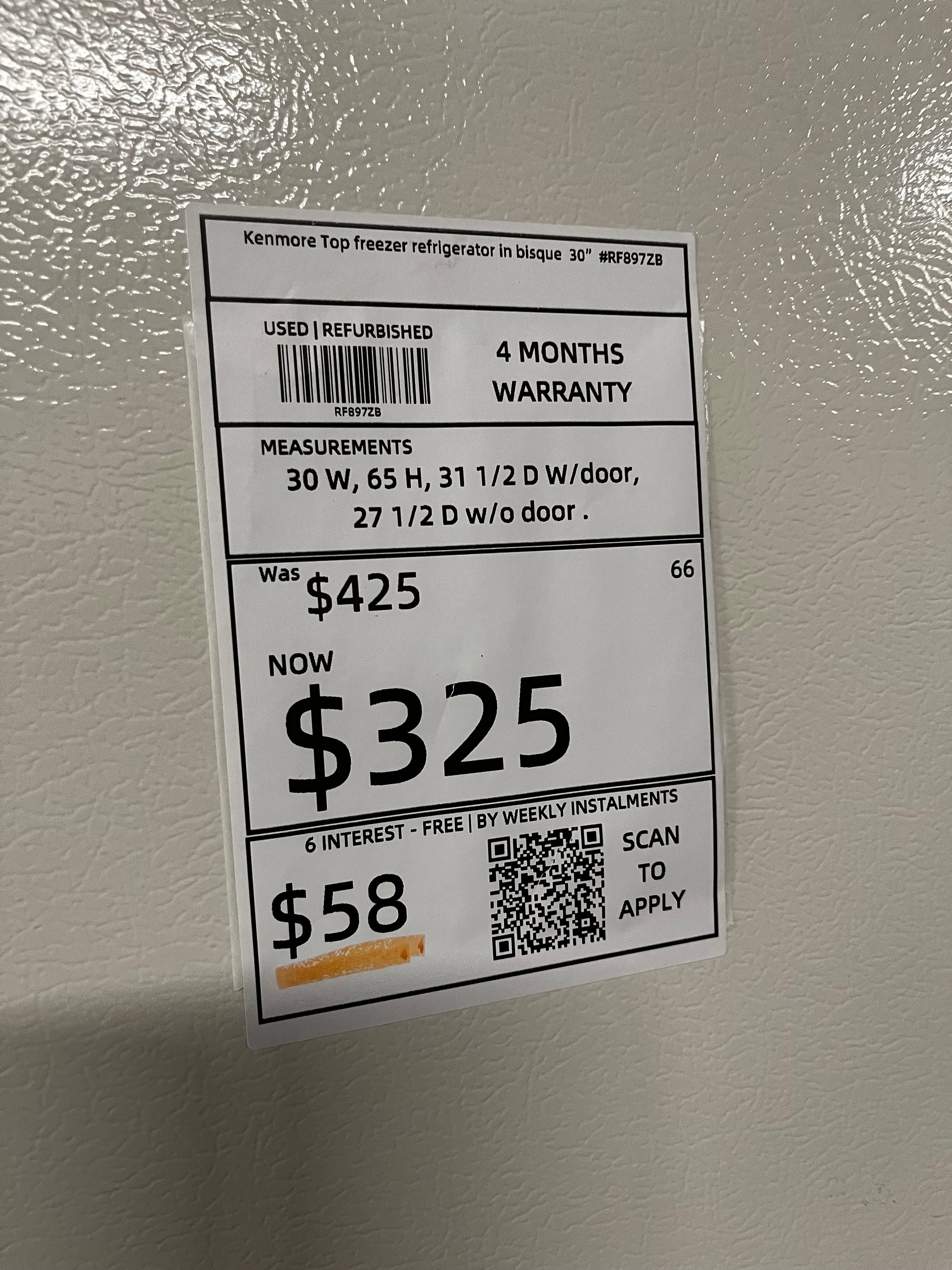 Kenmore top freezer refrigerator in off white used refurbished 33” #RF897ZB
