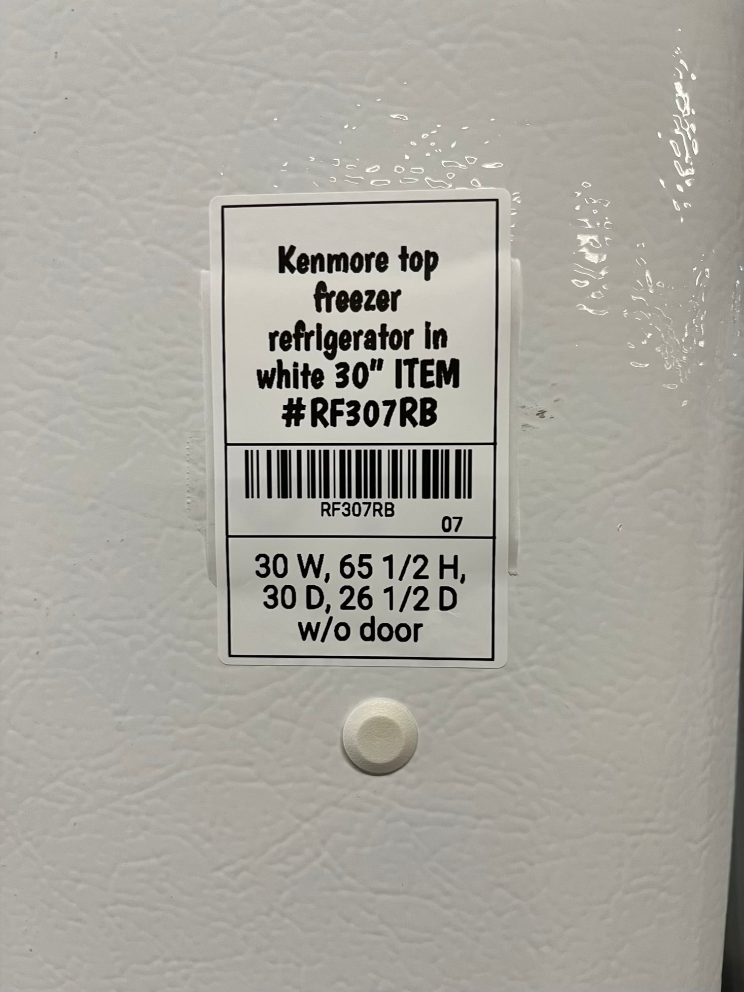 - Kenmore top freezer refrigerator in white 30" ITEM #RF307RB