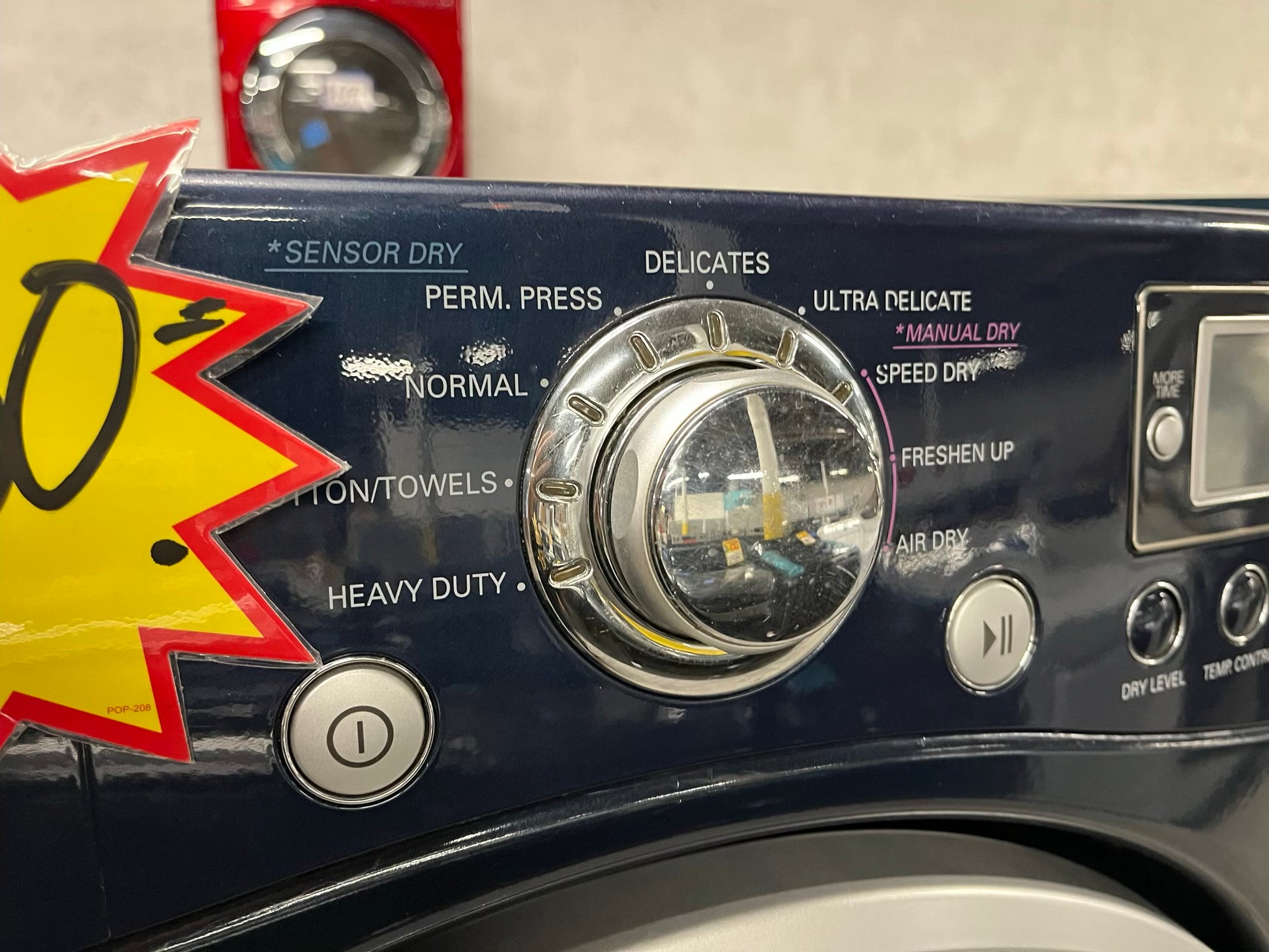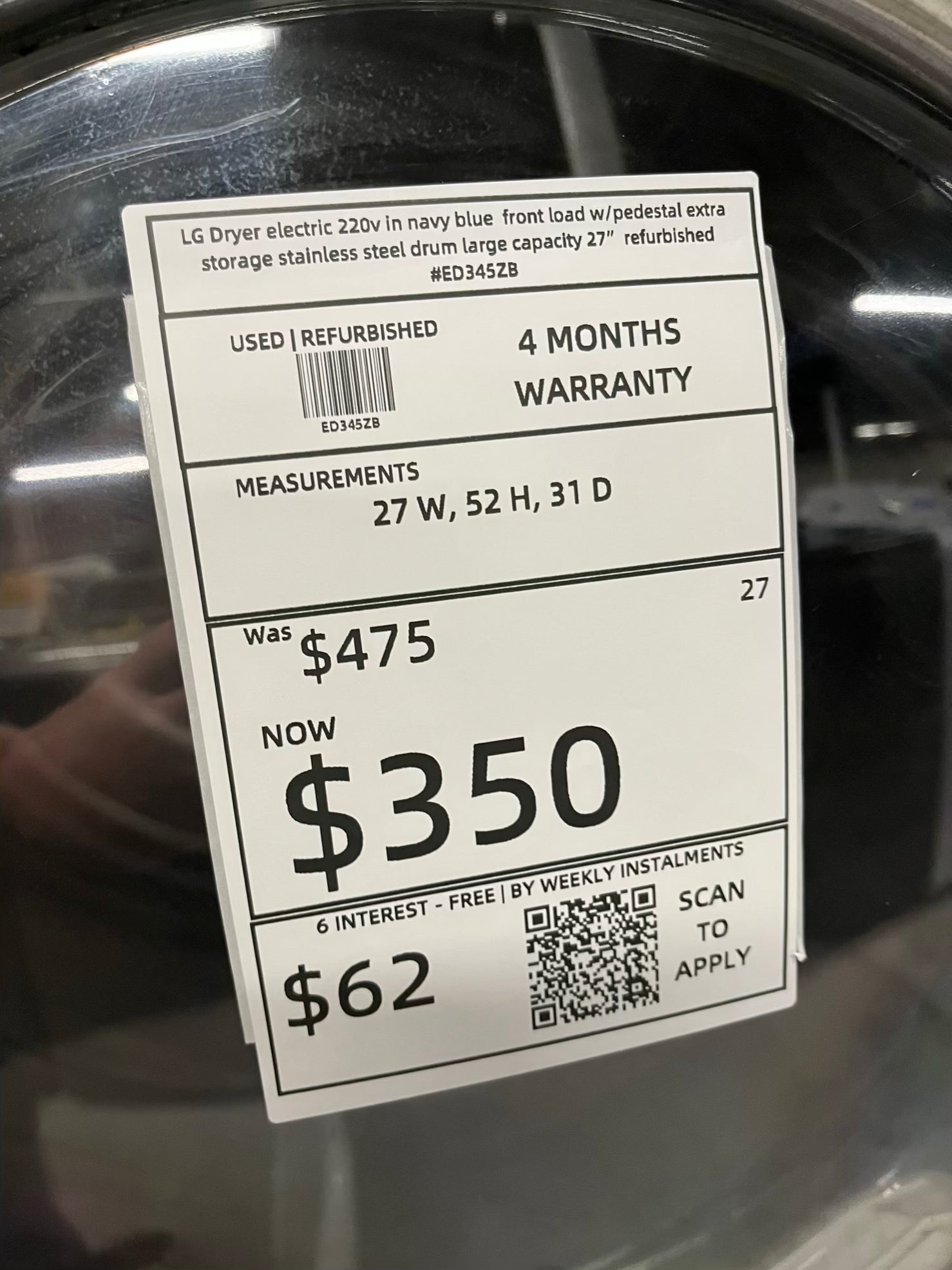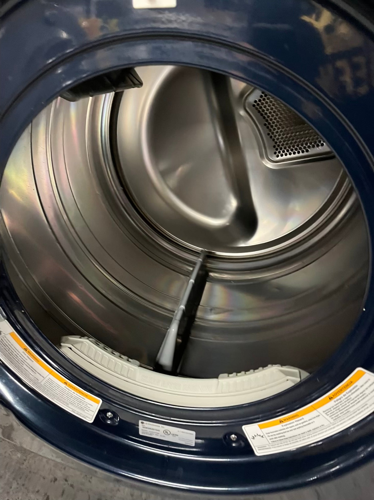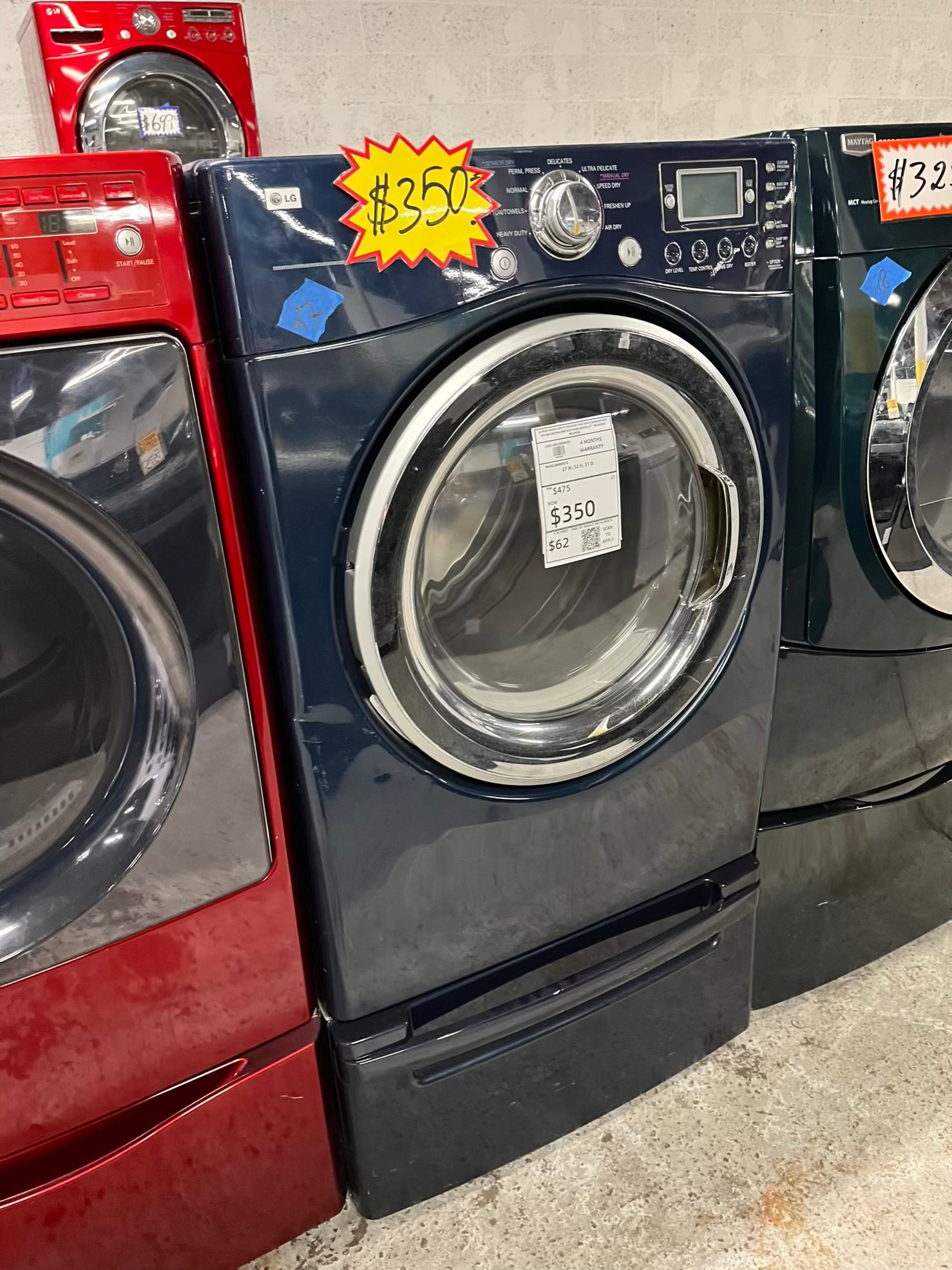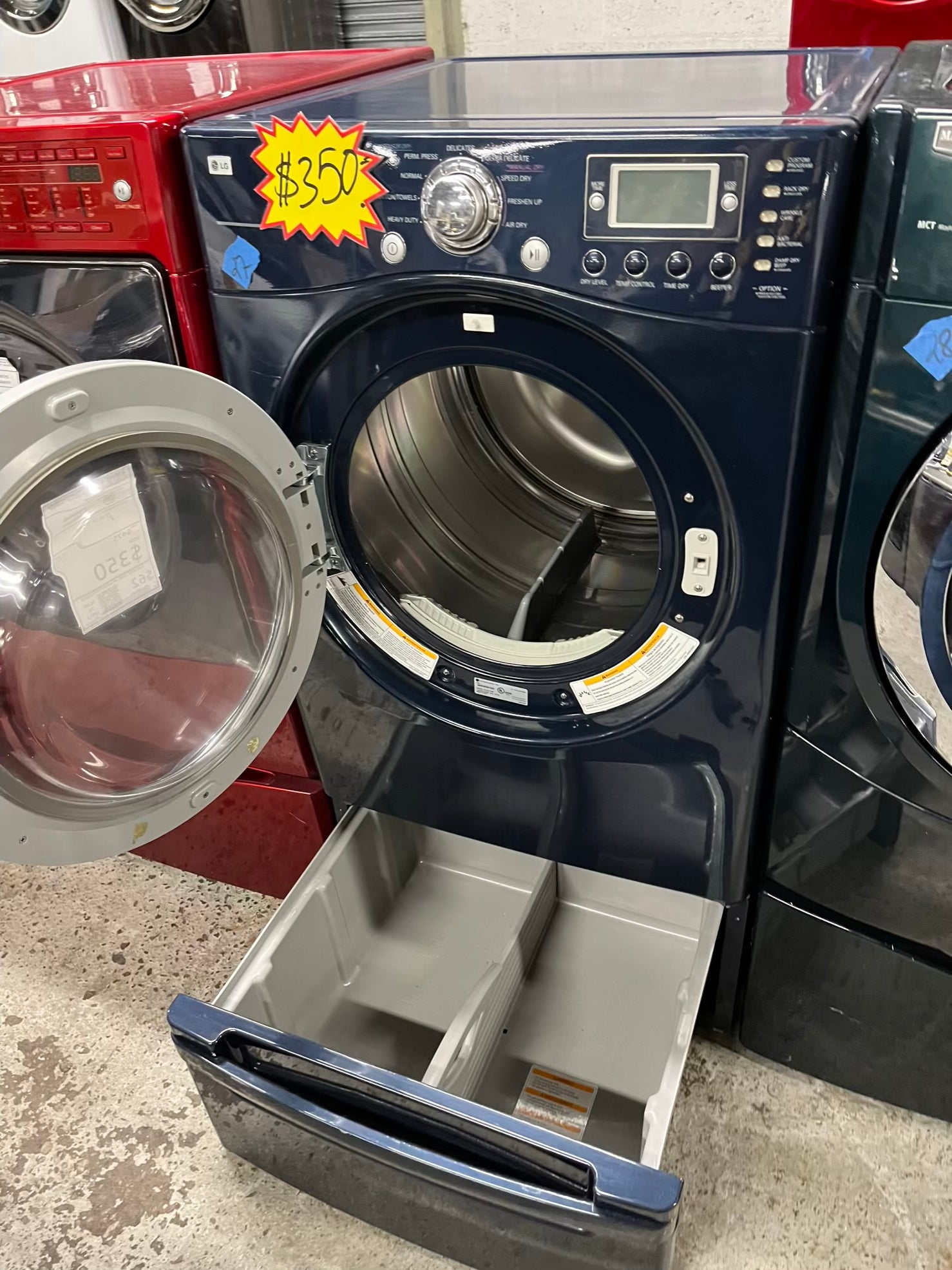 LG Dryer electric 220v in navy blue front load w/pedestal extra storage stainless steel drum large capacity 27" refurbished #ED345ZB