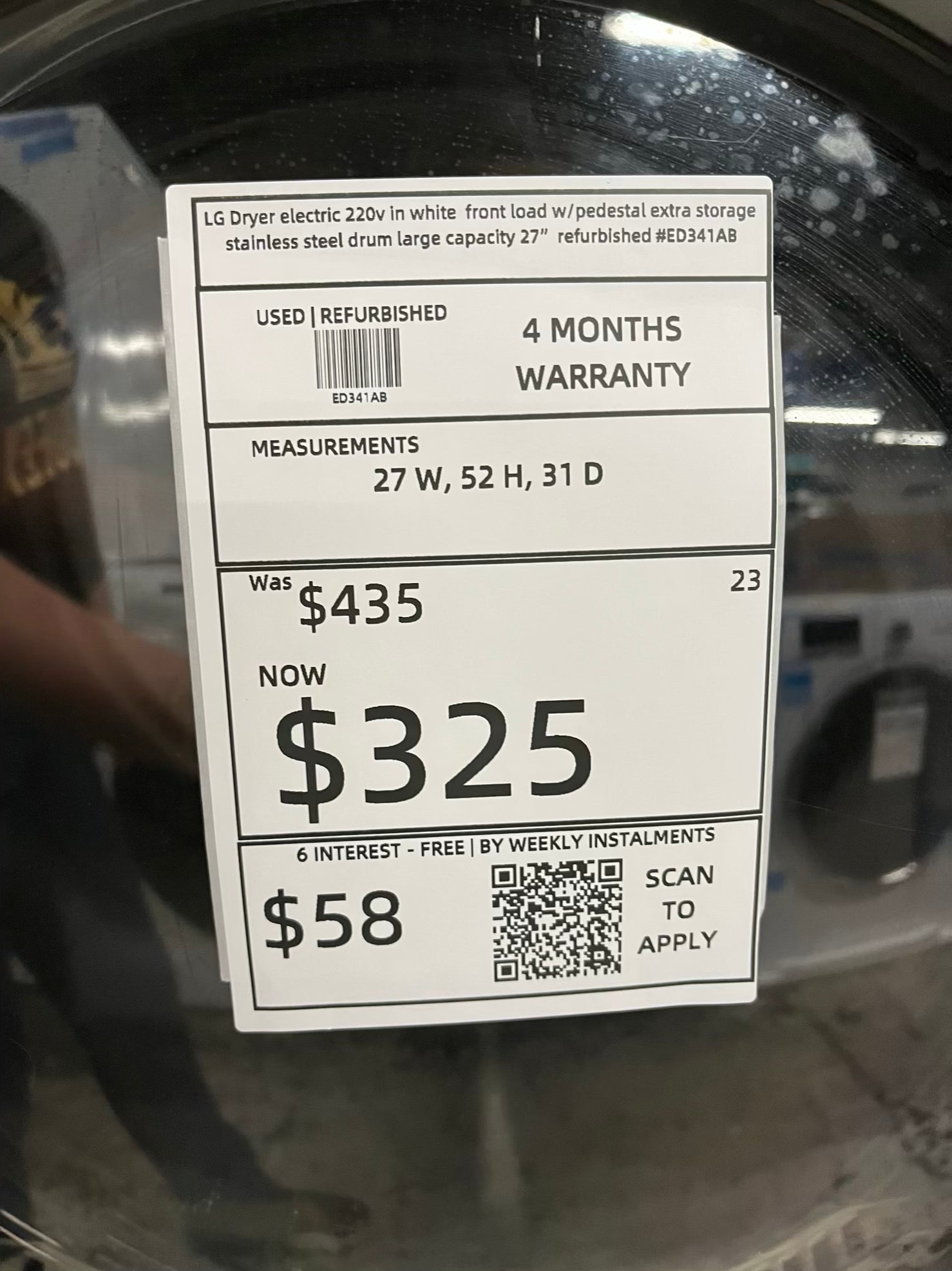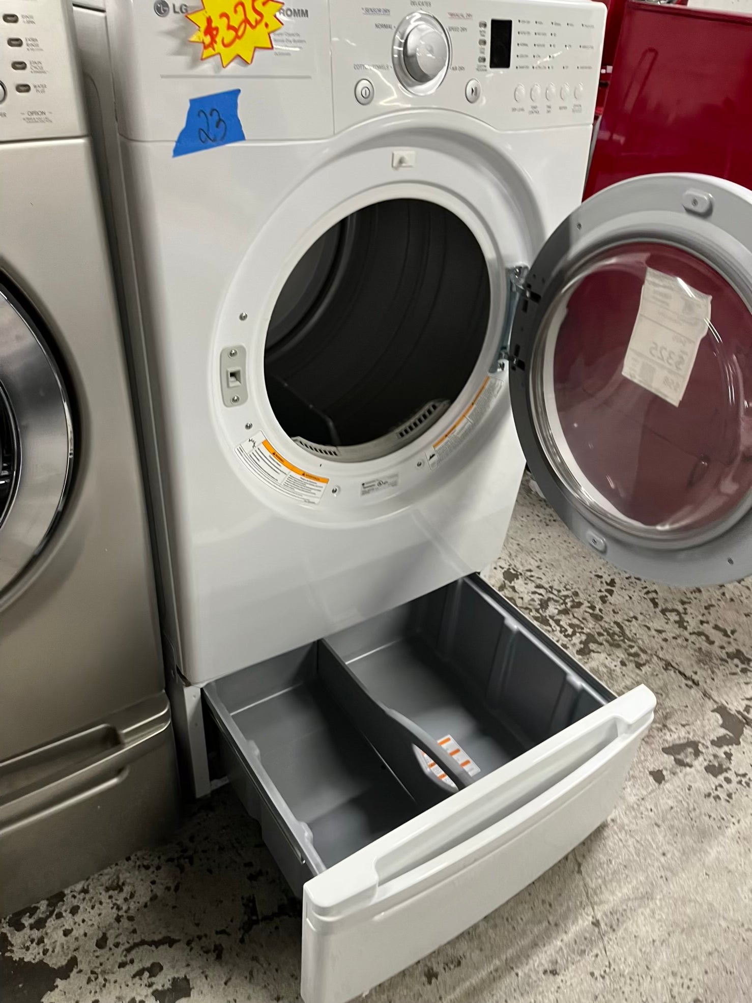 LG Dryer electric 220v in white front load w/pedestal extra storage stainless steel drum large capacity 27" refurbished #ED341AB