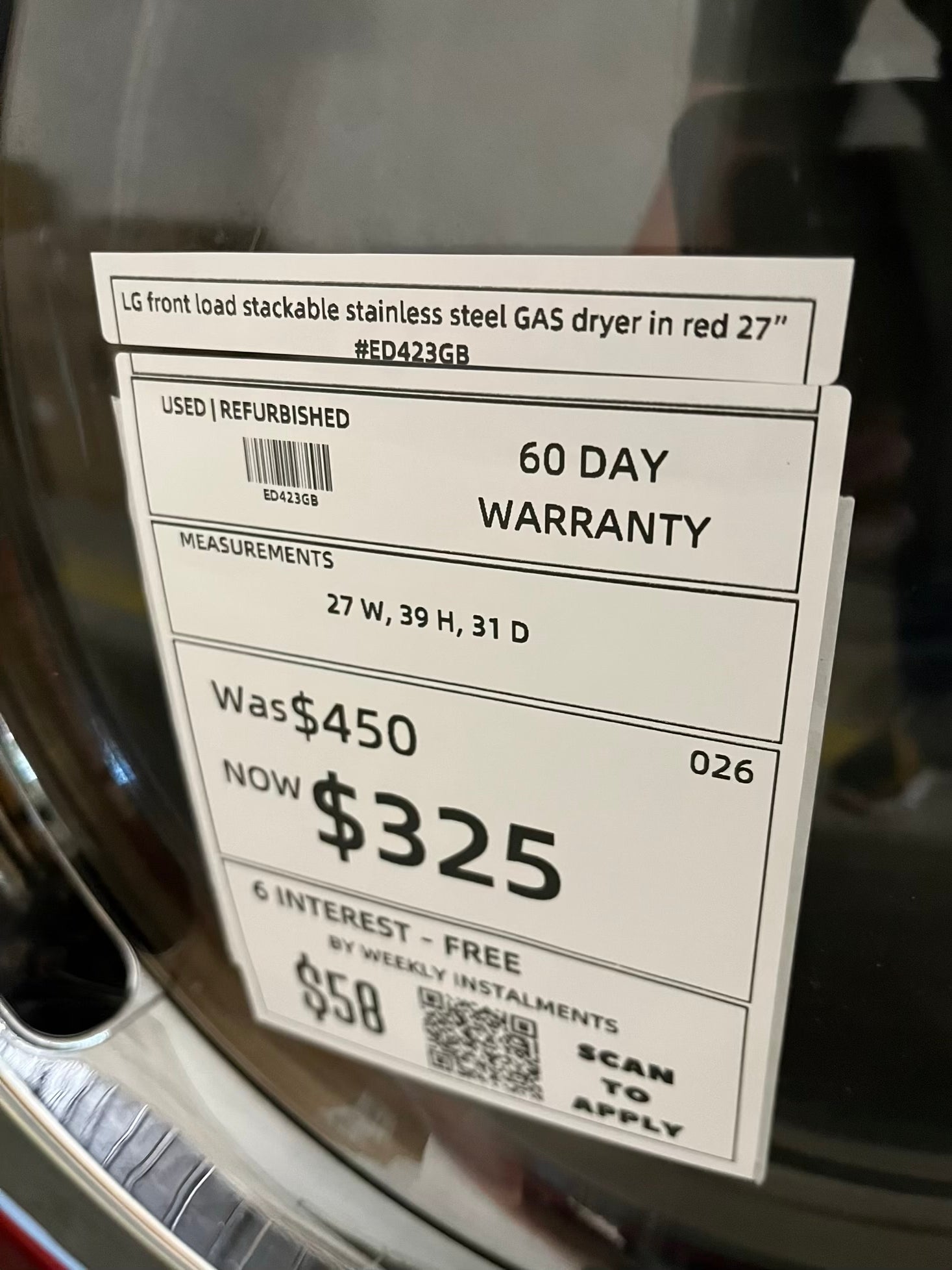 LG front load stackable GAS dryer in red 27" #ED423GB