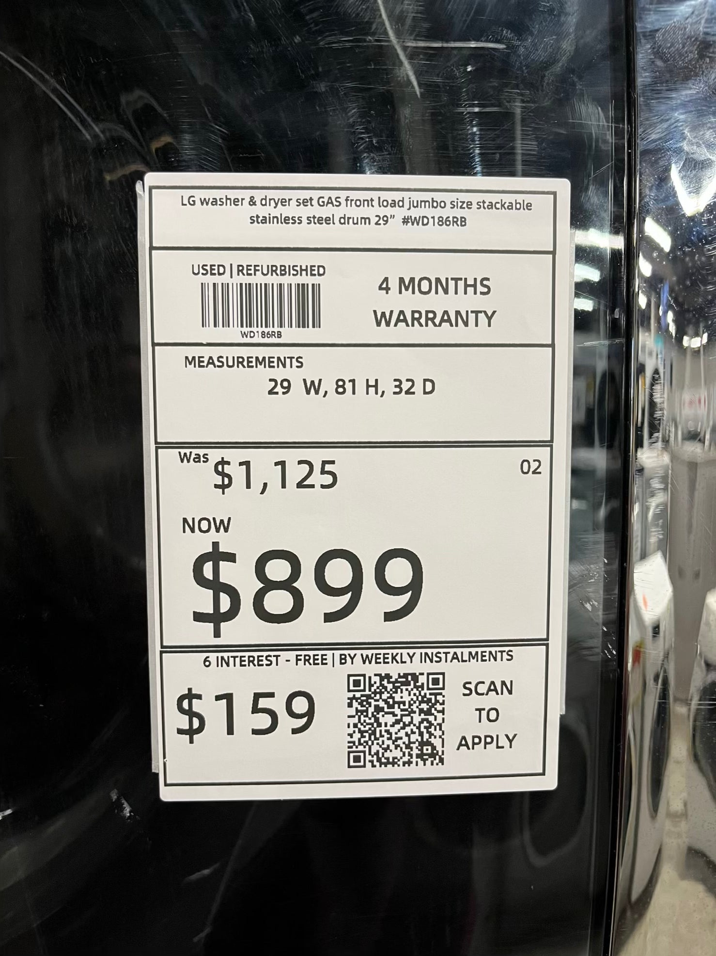 LG washer & dryer set GAS front load jumbo size stackable stainless steel drum 29" #WD186RB Refurbished