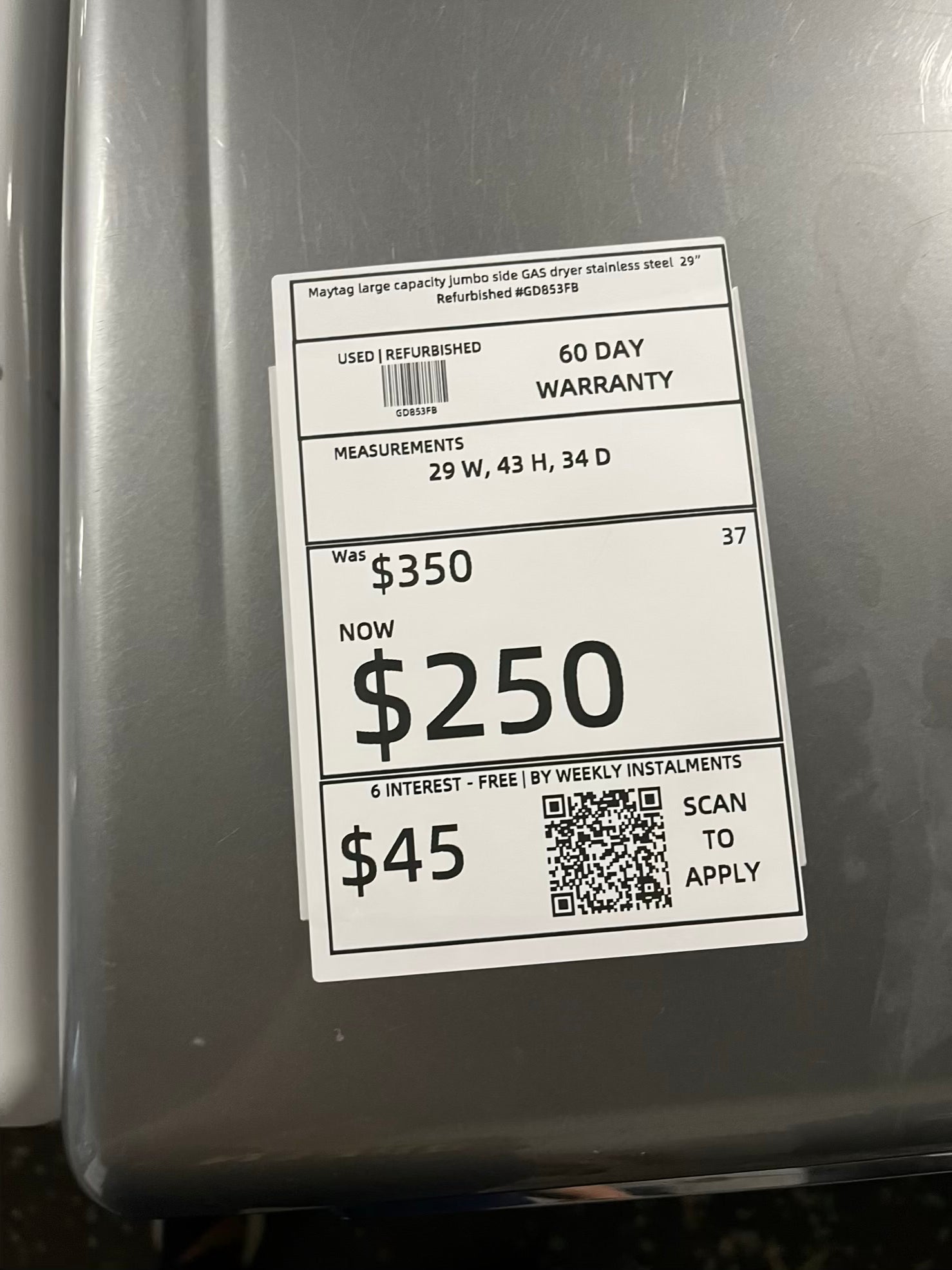 - Maytag large capacity jumbo side GAS dryer stainless steel 29" Refurbished #GD853FB