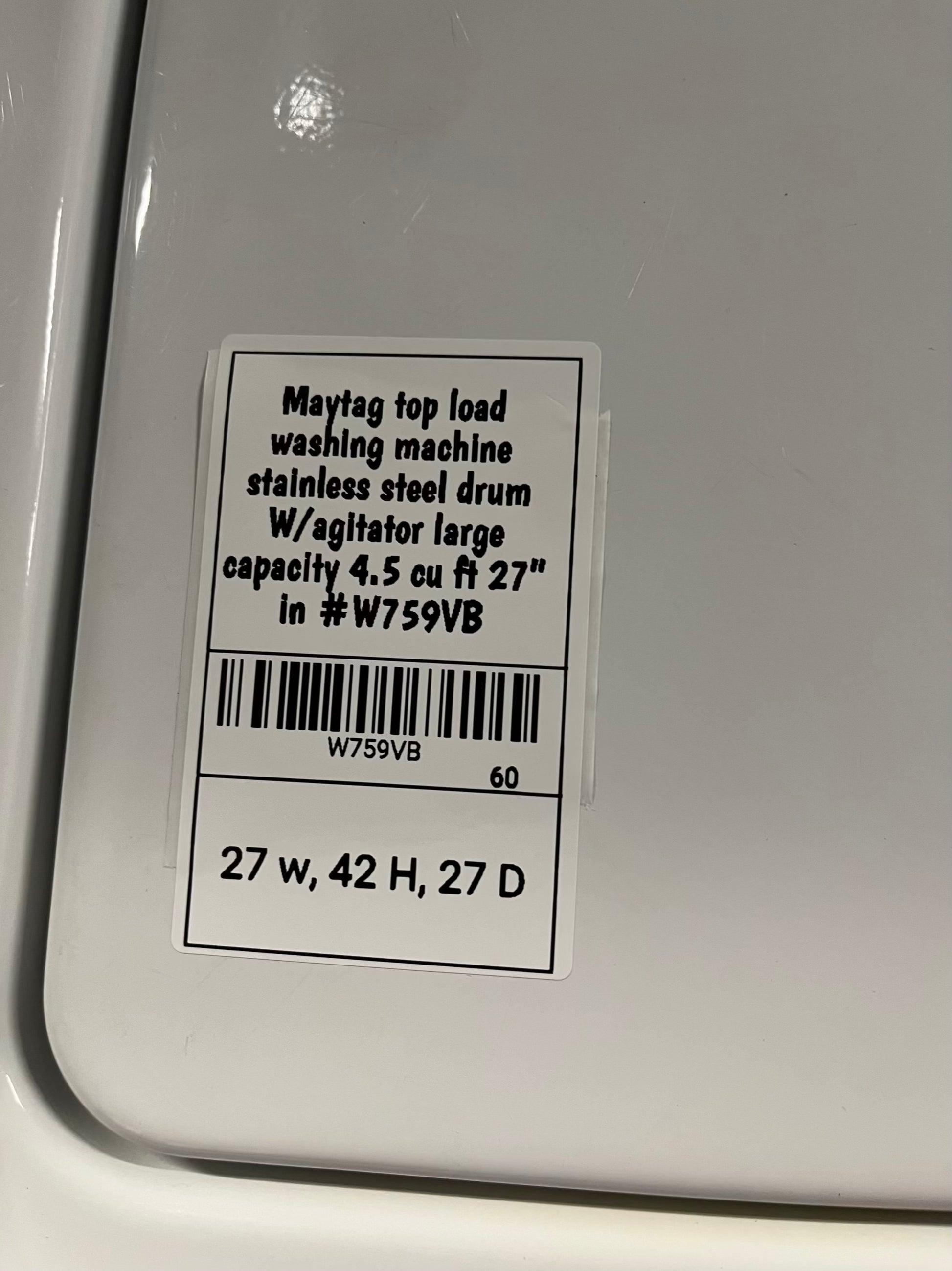 Maytag top load washing machine stainless steel drum W/agitator large capacity 4.5 cu ft 27" in #W759VB