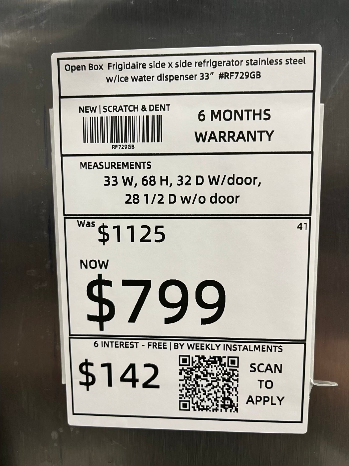 Open Box 📦 Frigidaire Side x Side Refrigerator stainless steel w/ice water dispenser - Item number #RF729GB 33” in