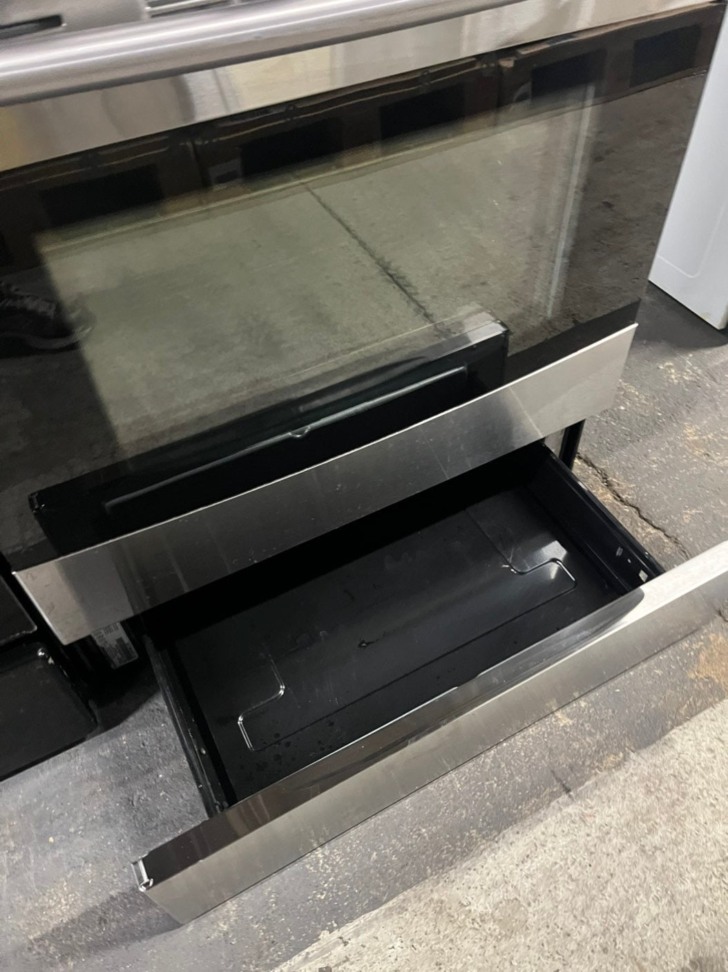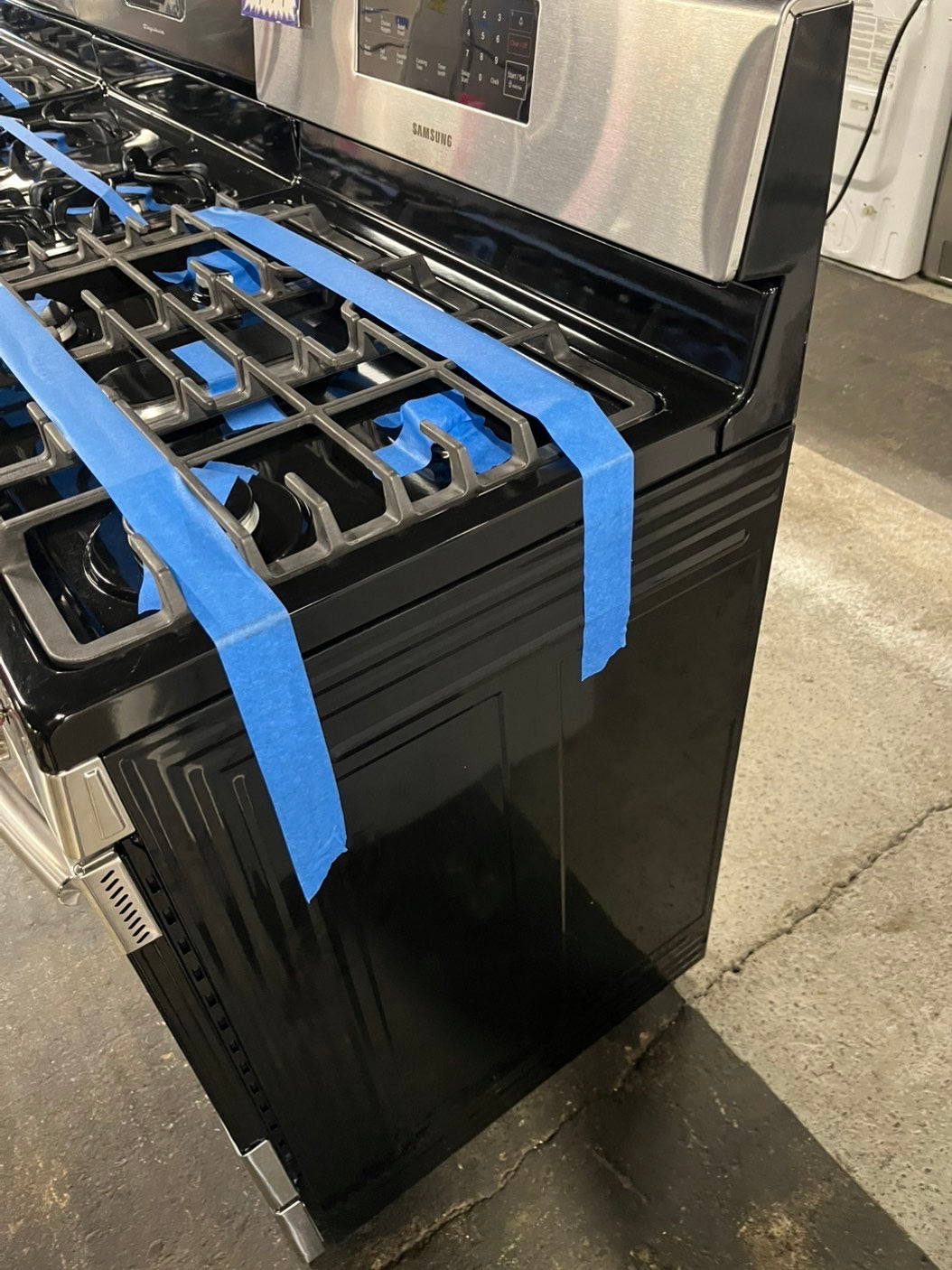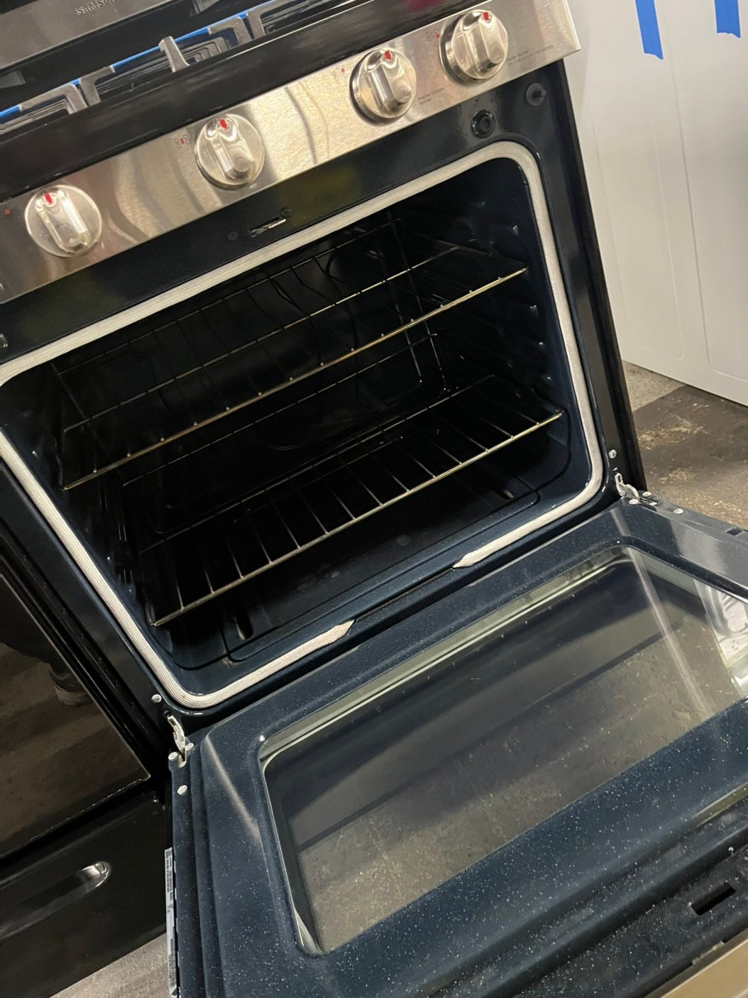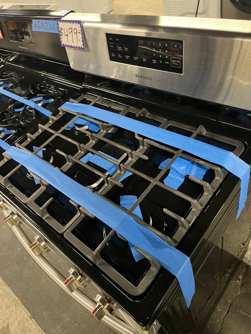 =Samsung gas stove 5 burner keep warm self clean bake broil i/lo in black & silver -used-Refurbished 30” #GTTA19B