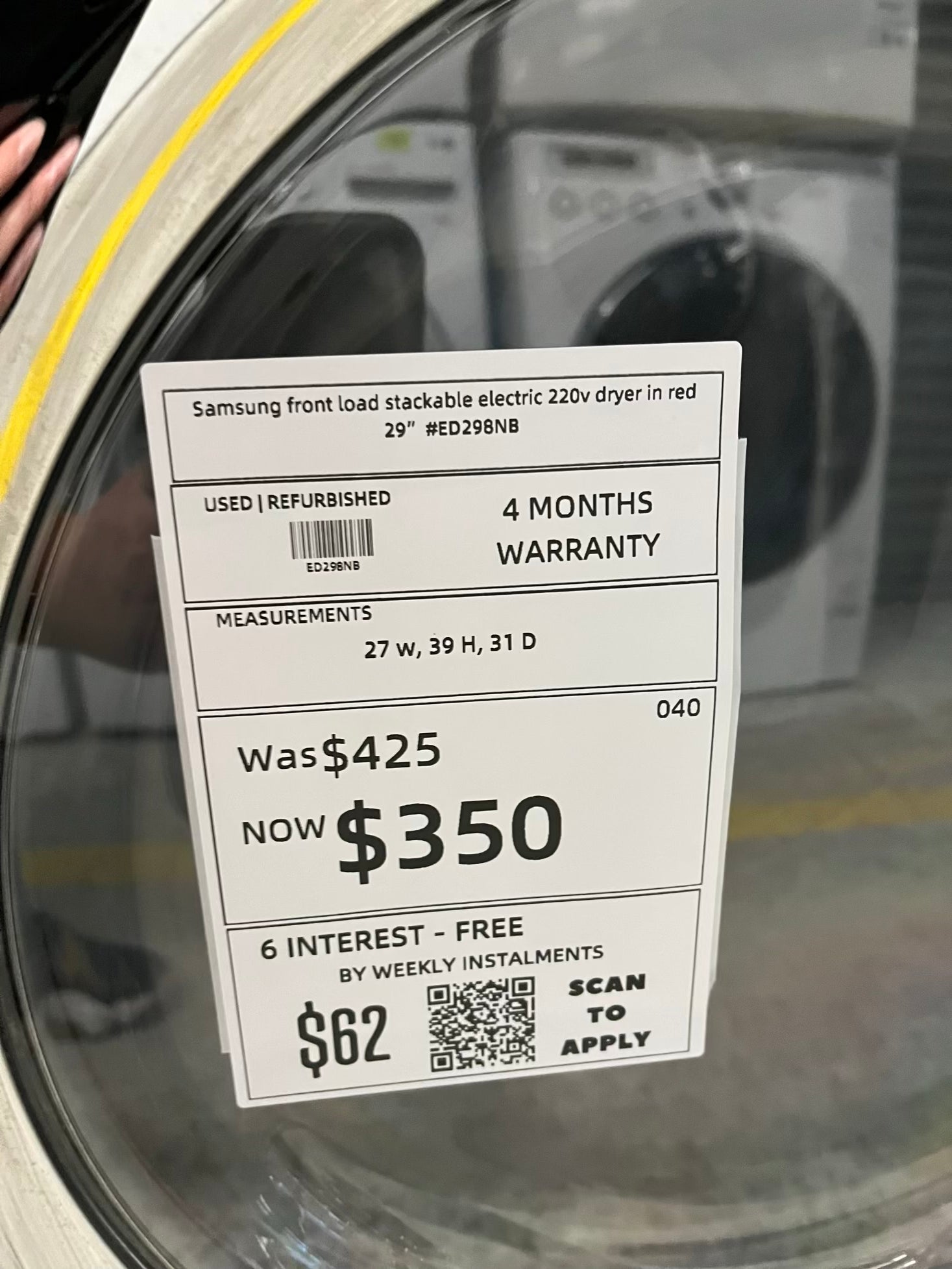 Samsung front load stackable electric 220v dryer in red 29" #ED298NB