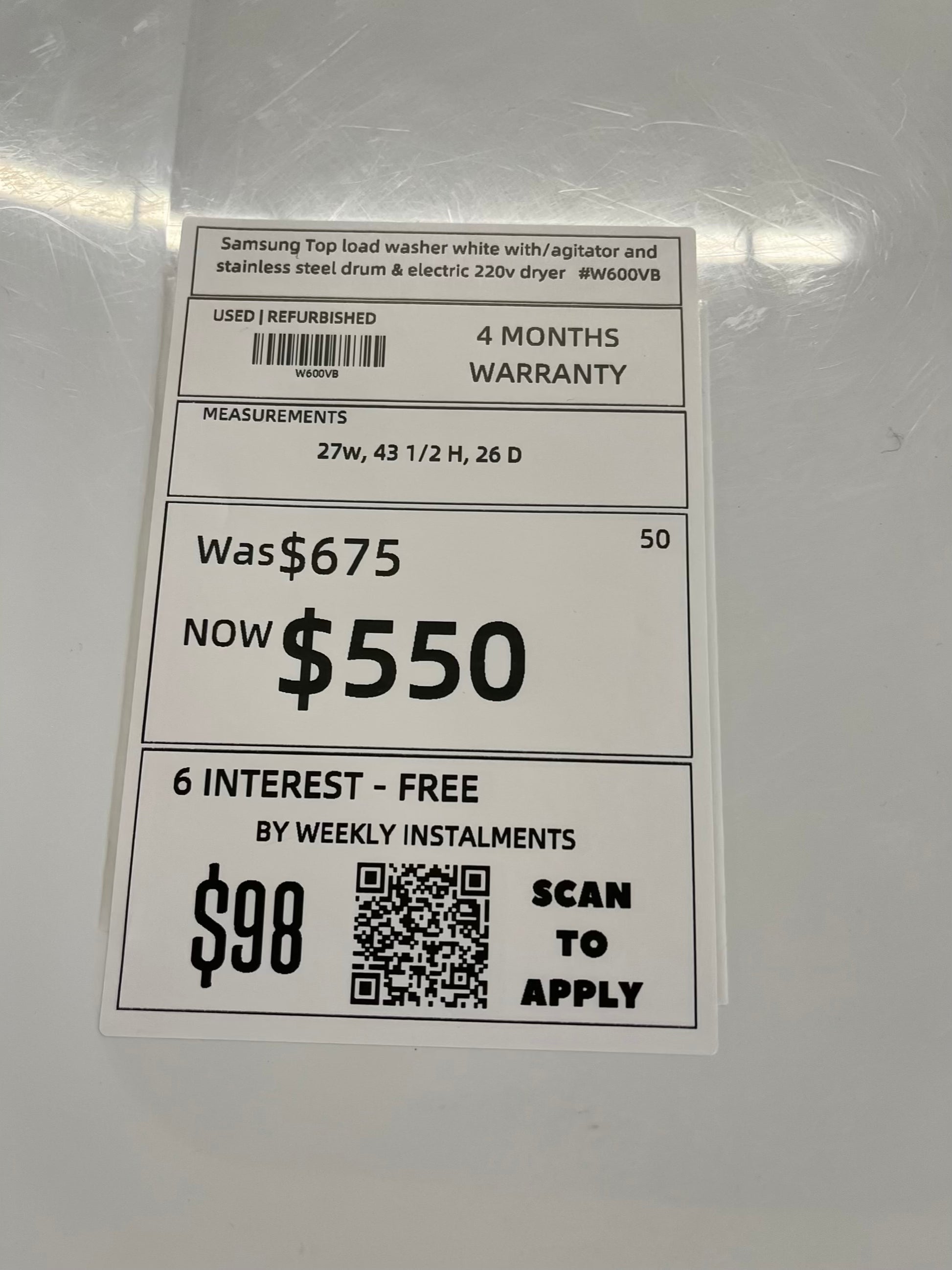 - Samsung Top load washer white with/agitator and stainless steel drum & electric 220v dryer -#W600VB