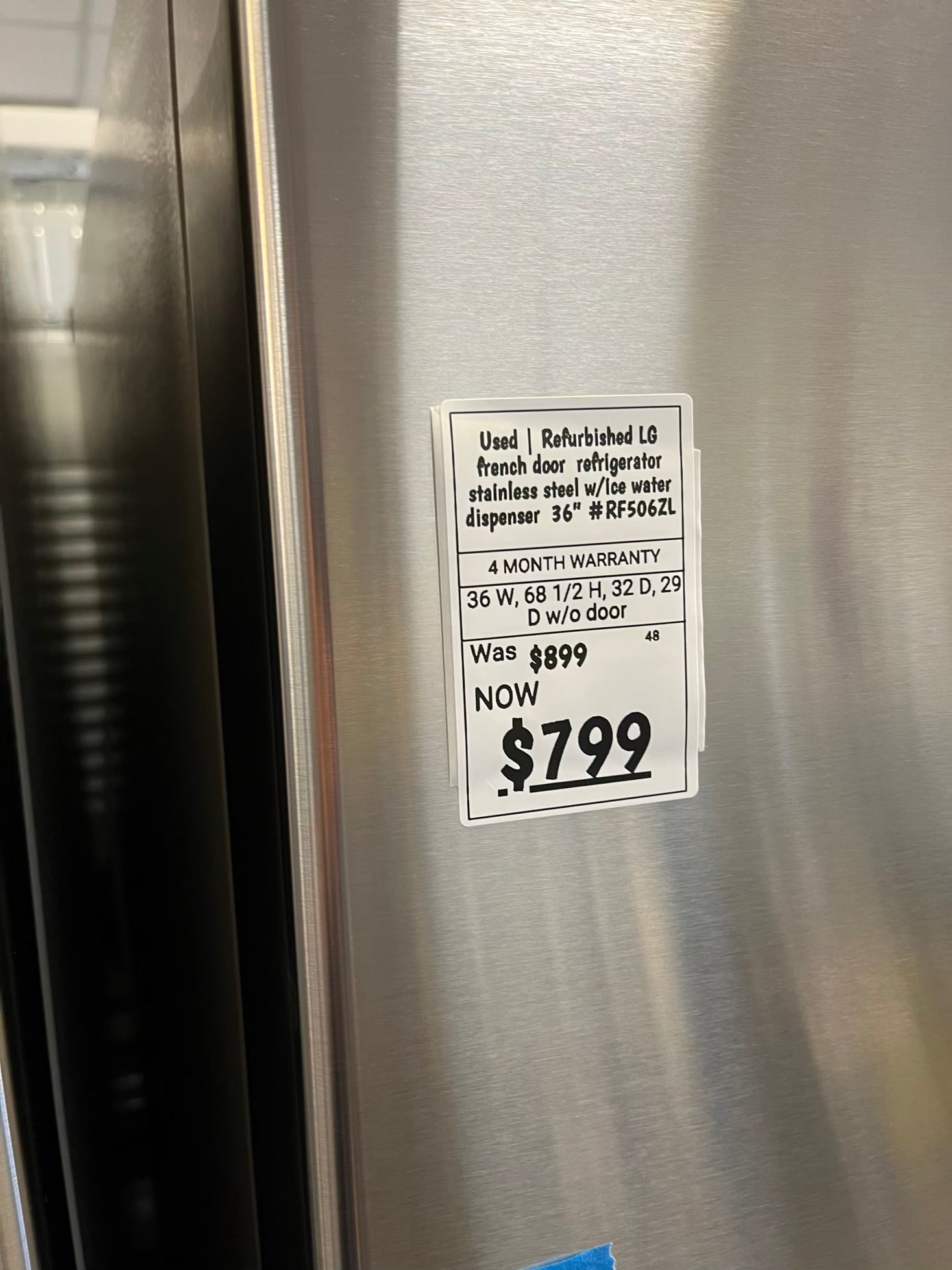 Used | Refurbished Le french door refrigerator stainless steel w/Ice water dispenser 36" # RF506ZL