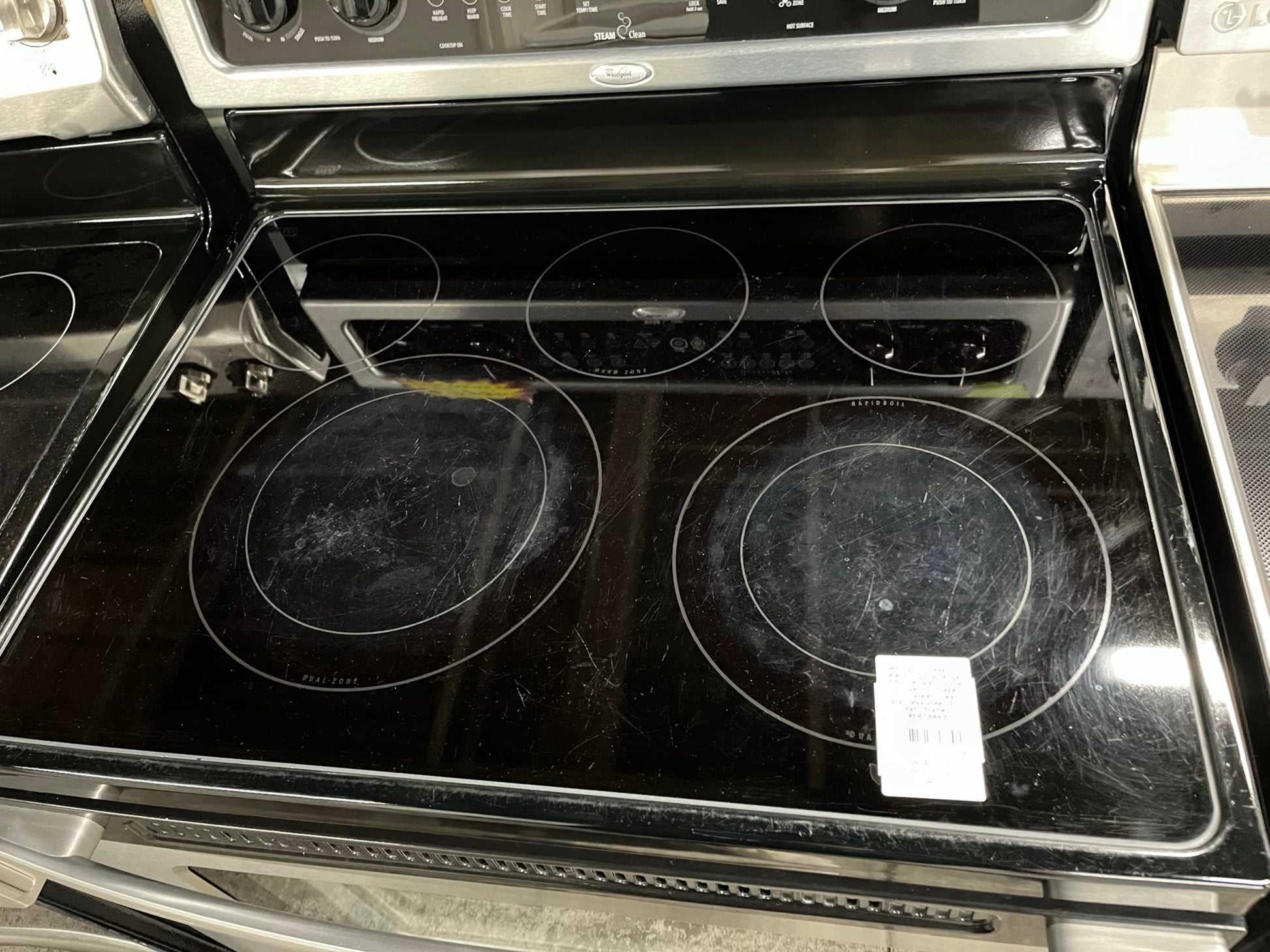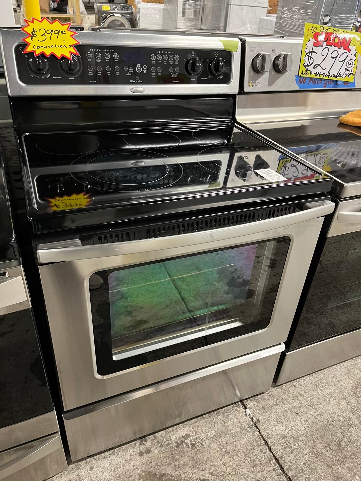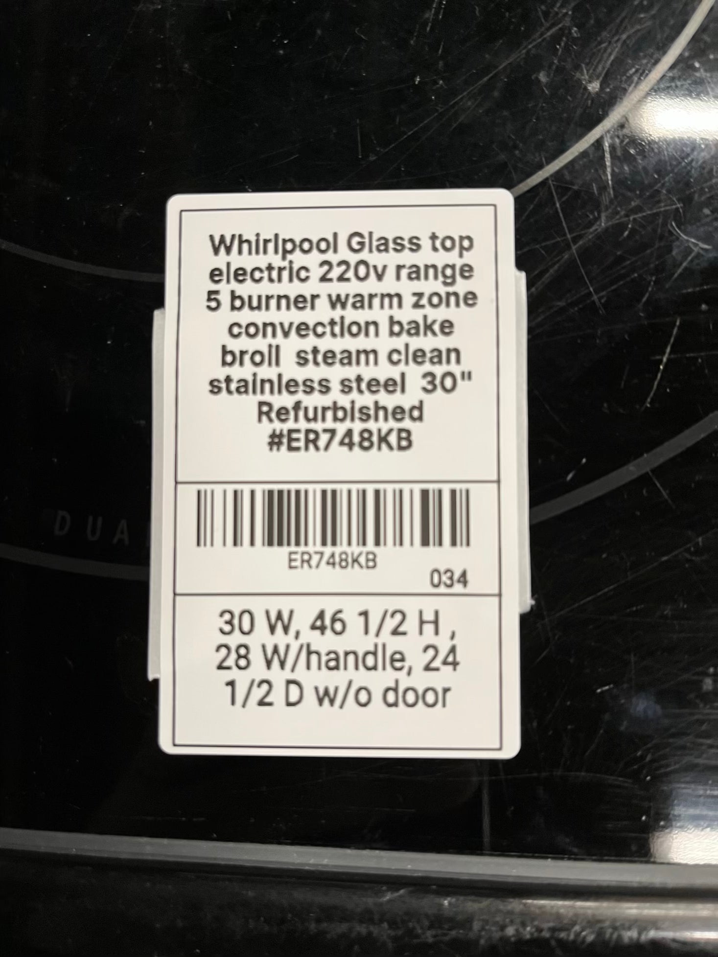 Whirlpool Glass top electric 220v range 5 burner warm zone convection bake broil steam clean stainless steel 30" Refurbished #ER748KB